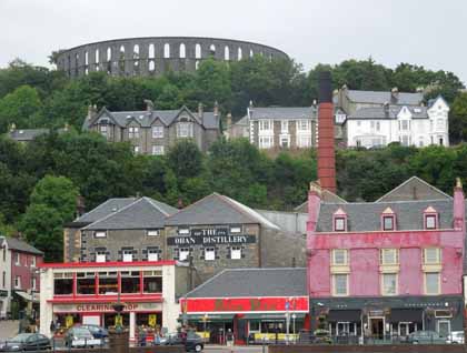 Lord of the Glens slid gently into Oban bay just about lunchtime and we had an excellent panoramic view of this busy little town, the hub for the Caledonian MacBrayne ferry system, the lifeline for the Inner and Outer Hebrides. From our vantage point on the water we could clearly see the very peculiar construction known as McCaig’s Folly sitting high above the town. Later in the afternoon we took a hike up the steep streets leading to the folly and learned all about its designer and builder, John Stuart McCaig, who was a Victorian banker and philanthropist employing local stonemasons in the winter (their slack time) to recreate the Coliseum in Rome. Today there is nothing inside the circular walls but there is a fantastic view over Oban Bay and across to the Isle of Mull and Ardnamurchan.