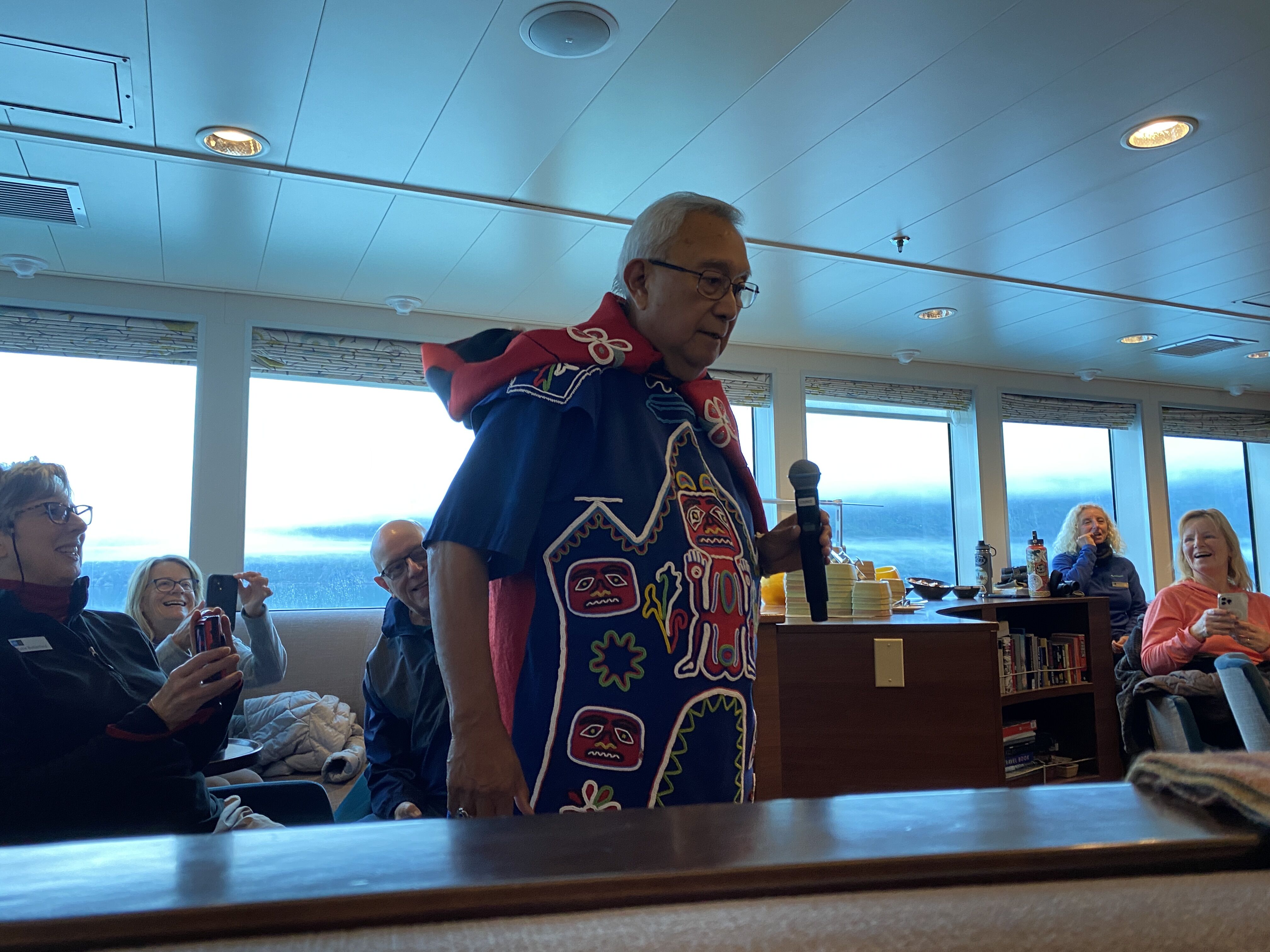 A pocket of beautiful sunlight shone on the totem poles of the Haida Heritage Center as we made our way past the town of Skidegate and into port in the community of Daajing Giids this morning. After breakfast, groups got on buses and headed to the trailhead of Spirit Lake. Our Haida cultural interpreter, Elsie, welcomed us to the trail and told us the story of Wasco, a supernatural being, part wolf and part orca, that makes its home in this area. Our hikes took different groups to different locations, and a beautiful time was had by all as we walked in a lush forest surrounded by so many shades of green. After lunch back on the ship, we took to the buses again for the Haida Heritage Center. Guided tours of both the inside and outside grounds of the center helped orient and inform us of the incredible history of the Haida people, who have lived on these islands for over 14,000 years. As we set sail during evening recap, a double rainbow appeared in the western sky – an incredible way to end this special first day in Haida Gwaii.