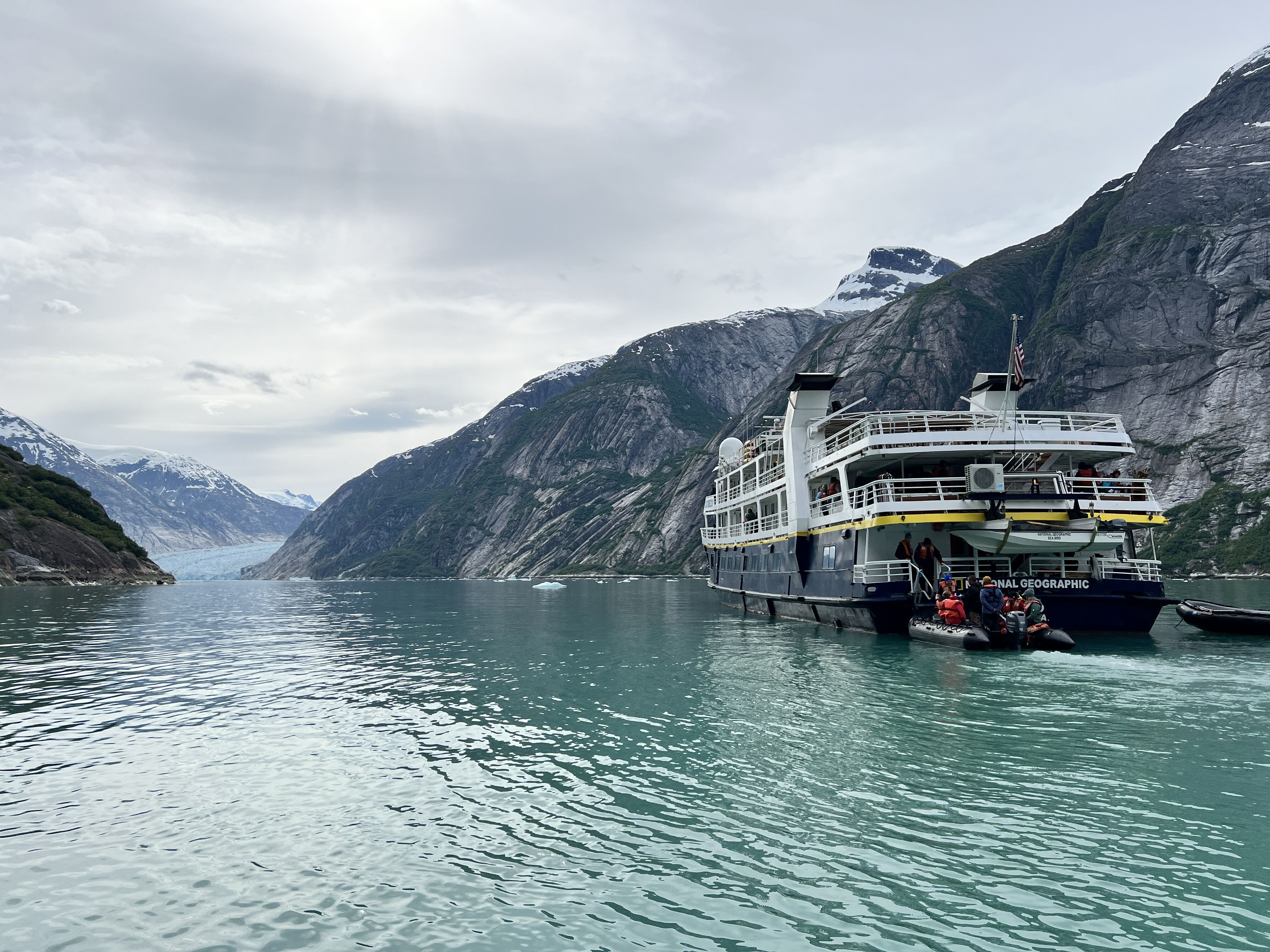 Today, National Geographic Sea Bird navigated to the magnificent Dawes Glacier. The morning mist shrouded our journey, lending a mystical aura to the fjords. As we approached the glacier, its towering ice walls and brilliant blue crevasses came into view. The sound of ice calving—a thunderous crack followed by a splash—reminded us of the glacier's dynamic nature.