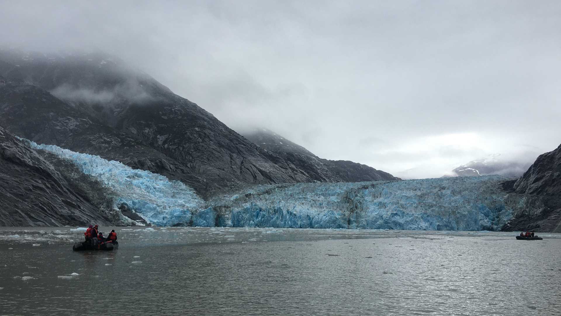Our anticipation continued to grow as we watched glacial floes and bergy bits grow bigger and more numerous during the ship’s approach while we had our breakfast. And all of a sudden, we saw Dawes Glacier in the distance, majestic and climbing as far back into the mountains as the eye could see (and as far back as the rain and mist would allow us to see). Our intrepid explorers jumped into the boats to explore the front face of the glacier and were not disappointed. We saw spectacular blue colors, and pillars, and crevasses, and tried to guess how high those ice towers could be and imagined mountaineering across those landscapes. We listened to the thundering, and just as we held our breath after another thunder from the glacial face, a gigantic ice tower broke off, crashed into the water, and sent waves half a mile away that gave us a mini rollercoaster ride. After this incredibly beautiful tour in the morning, we had some brave souls who decided to jump in for a Polar Plunge! We salute them all for their icy courage!