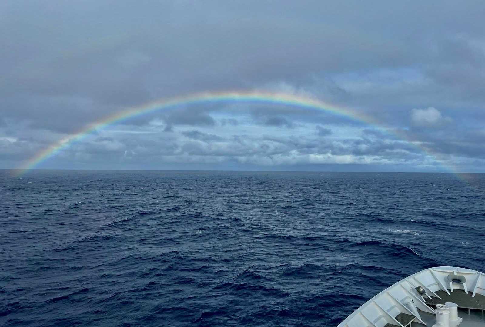 An extra hour of sleep was in the program for today as we set our clocks back an hour last night, which welcomed the morning announcement and breakfast gathering a little later, too. Just before breakfast, a large full rainbow greeted those up early while enjoying the first sips of coffee from the decks above the bow. National Geographic Orion crossed over another 15 degrees of longitude, making yet another time change as we headed west towards the Vanuatu Islands.