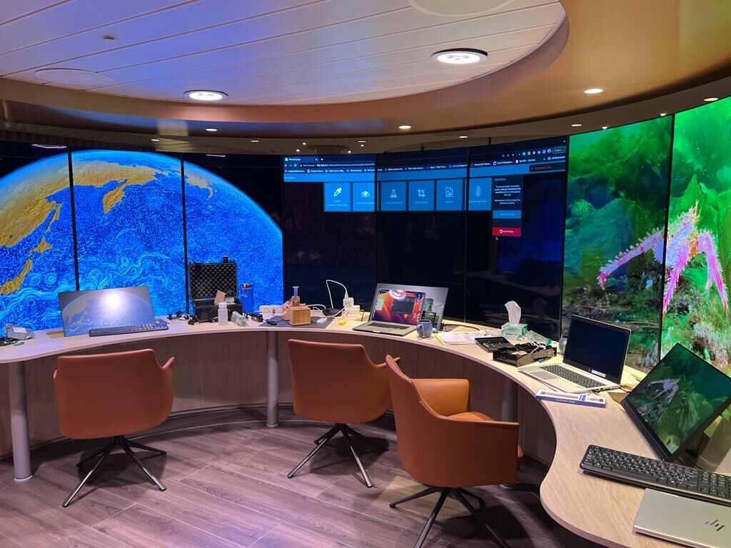 With the galley, bar, and restaurant staff, hotel director Juan-Sebastian wowed guests with exquisite cuisine and beverages throughout the day. Photo instructor Michael Nolan and National Geographic photo expert Nitye Sood gave presentations in the Ice Lounge. Visiting scientists Andrian and Jun Jet Tai and Grosvenor Teacher Fellow Kelly set up workstations in the elaborate Science Hub in the den on deck eight. On the outer decks, birders Santiago and Brett were busy observing as varieties of their favorite birds surrounded the ship, much to the joy of our guests.