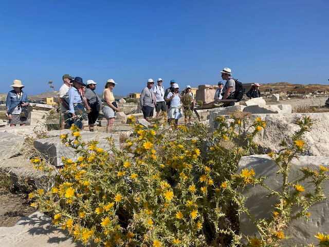The unofficial guardians of Delos greeted us this morning, a clipped-ear furry brigade of assorted color and heritage cats. The resident peacock could be heard calling back by the lion statues. Welcome to the center of the Greek mythological world, the “floating island” of Delos. In ancient times, the sounds would have been associated with the hustle and bustle of commerce, or perhaps the oration of a play in the theater. This morning, the crested larks sang as we wandered through a historical landscape with engaging narration by Evangelos and Dionysis, our two Greek guides. A climb to the top of Mount Kynthos topped our terrestrial explorations, and a dip in the Aegean upon our return to the Sea Cloud topped our aquatic explorations.