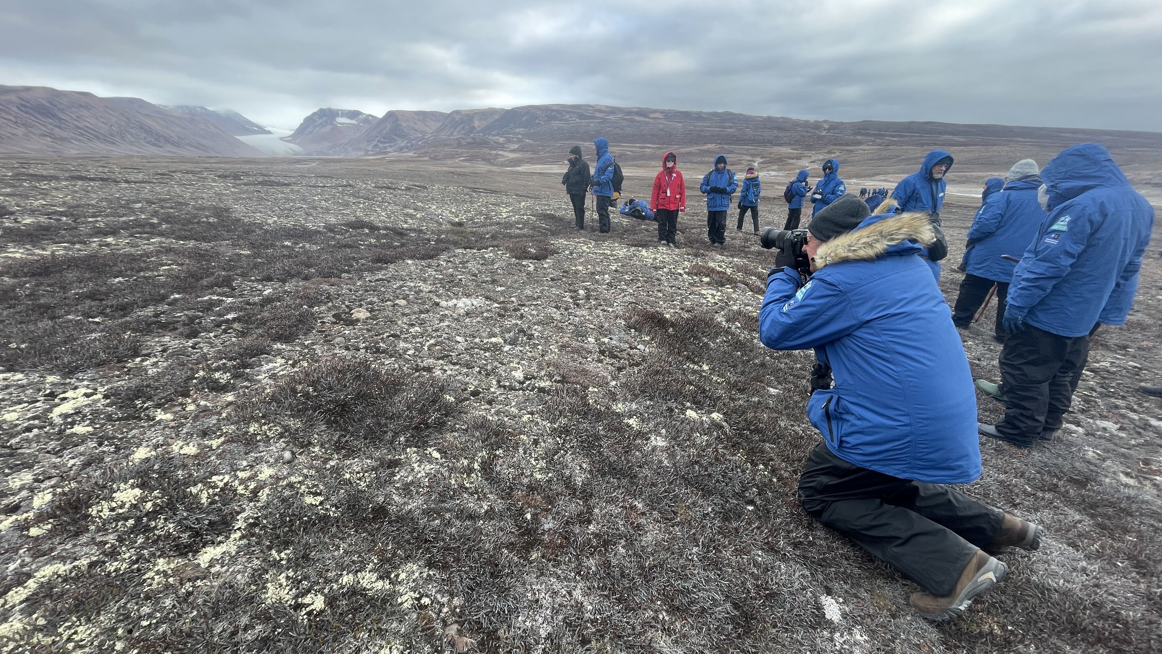 Today we explored Kajser Franz Joseph Fjord, one of the largest fjord systems in the Northeast Greenland National Park. We began the day at Blomsterbugten, hiking through a tight mountain pass to an overlook of an alpine lake. Along the way, we encountered a few Arctic hares, some muskoxen, and some very fresh polar bear tracks! Other guests opted out of the hike and took the opportunity to try out our kayaks instead. In the late afternoon, National Geographic Endurance settled in front of the Westerhausen Glacier, and Zodiacs were launched for a chance to view the glacier up close and personal. We spotted a number of very friendly ring seals from the Zodiacs. After a special Filipino dinner, everyone gathered in the Ice Lounge for the world famous “Shackletunes” crew show!