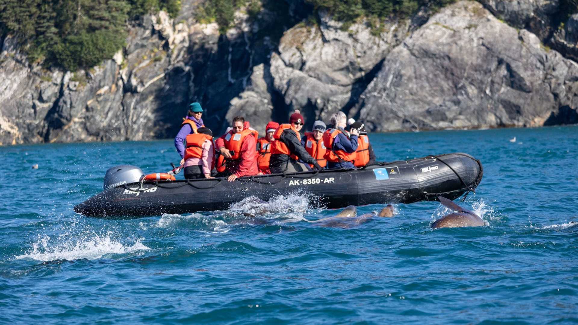 Following lunch, we began Zodiac tours of the Inian Islands. If Dundas Bay is uncharted territory for our staff, the Inian Islands are like our favorite hometown bar — a place where we can relive memories, share some smiles, and reconnect with old friends. In this case, our friends were the wildlife of the Inians, namely Steller sea lions, tufted puffins, bald eagles, and sea otters. By this time any remnant fog had burned off, giving way to blue skies and views of the far-off Fairweather Mountains. Expert navigation from our Zodiac pilots placed us in prime position to engage with this wildlife. From juvenile sea lions rolling in the surf to massive otters whacking crustaceans from out of their shells, the day was a true success in terms of wildlife sightings.