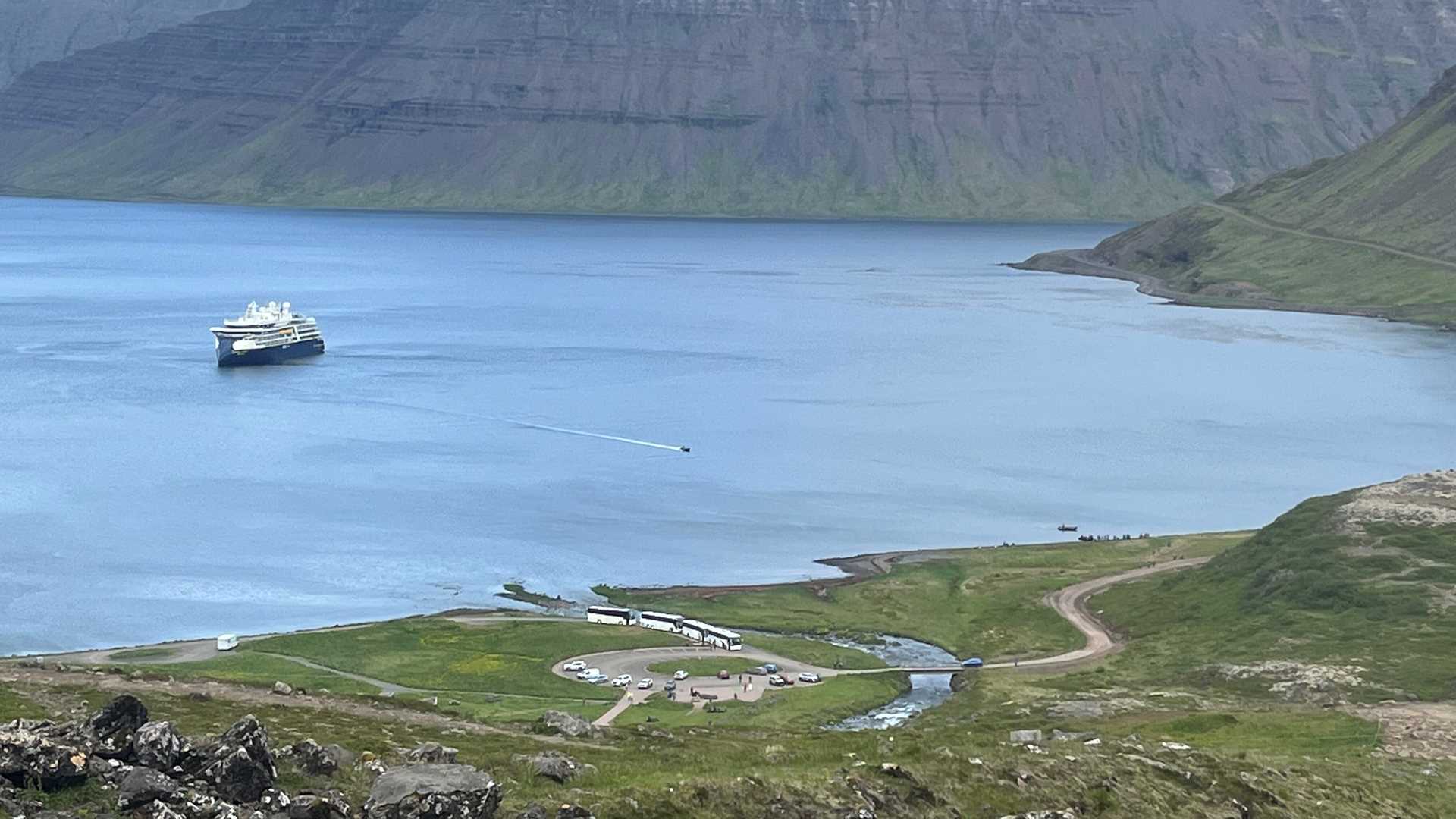Forget about the worm. Here in Iceland today, the early bird got a beautiful, secluded walk that led to one of the world’s most beautiful waterfalls. After a quick breakfast, Zodiacs dropped us on the southern shore of Arnarfjörður, in the West Fjords. As we strolled through the beauty of this stunning glacial fjord, the famous falls of Dynjandi were initially out of sight. As we ambled eastward, the towering curtains of cascading water came into view, and oooooohs and ahhhhhs were audible as the great waterfall stood tall before us. Those who did not want to start their day with a coastal hike were dropped at the base of the waterfalls, and the stunning view was enjoyed by all.