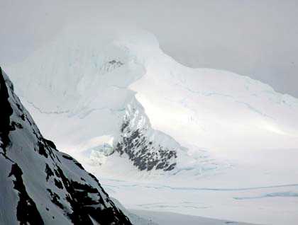 The coastline here consists of narrow headlands that demarcate individual shallow bays. These latter are backed by deeply fractured valley glaciers many hundreds of feet in height. These are streaked blue along the edges of the numerous crevasses. A deep, thunderous roll announced the collapse of a section of one of the glaciers.