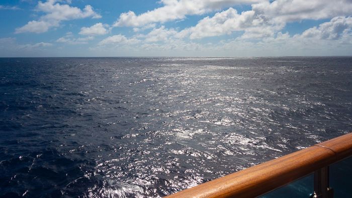 By the end of today, we had already sailed over 1,300 nautical miles; near a quarter of which had been covered on Monday alone. The wind was noticeably stronger in the morning, averaging between 22 and 25 knots from the northeast, then easing off in the afternoon. All day we felt the ship moving beneath our feet with a swell average of 2 to 3 meters. Though there were moments of rain and wind, the ocean water temperature was a comfortable 84 degrees Fahrenheit. We are still in paradise!