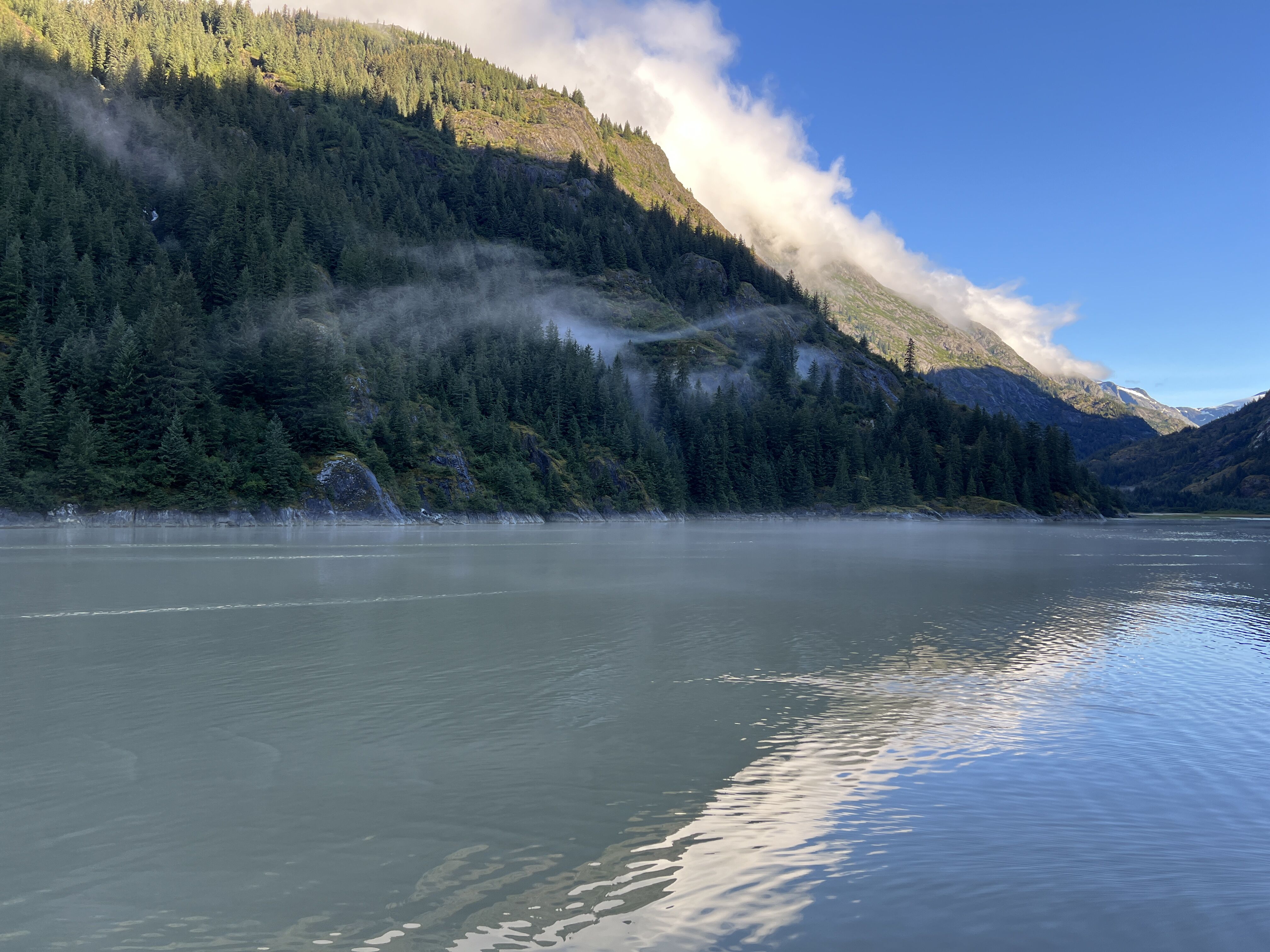 In the early morning, National Geographic Sea Lion crossed over the terminal moraine of the glaciers that formed Endicott Arm and Tracy Arm. Mist lined the sides of the glacially carved fjord walls, and fog shrouded the valleys and the waterway.