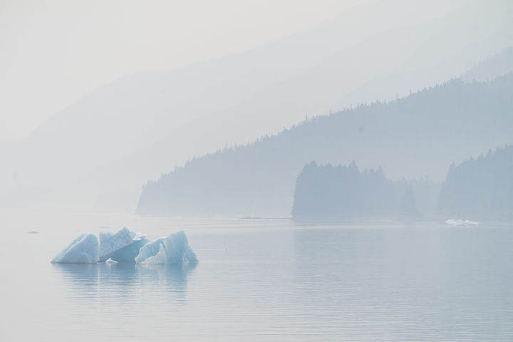 We awoke at the terminal moraine bar in Holkham Bay at the entrance to Endicott Arm. A light haze hung in the air, creating varying blue layers of hills and mountains around the bay. Humpback whales surfaced and blew in several directions. Clouds above created soft light that brought out the blue in the “bergy bits” (smaller pieces of icebergs) that floated by. We entered a section of the bay where hundreds of surf scoters floated alongside Canada geese, and marbled murrlets bobbed in the calm reflective waters. Bald eagles sat atop ice floes, riding them out in the current and flying off to fish now and then. The bay was a hub of activity this morning! After breakfast, we continued our journey up Endicott Arm towards Dawes Glacier, inside Tracy Arm-Fords Terror Wilderness within the Tongass National Forest. Bits of incredible blue ice floated past us languidly in reflective waters. We stopped within view of the glacier and launched Zodiacs to explore the ice, waterfalls, and amazing geology of this fjord. All of us learned about the geology and natural history of the fjord, and several guests witnessed calving ice off the face of the glacier while others explored beautiful pieces of textured ice.