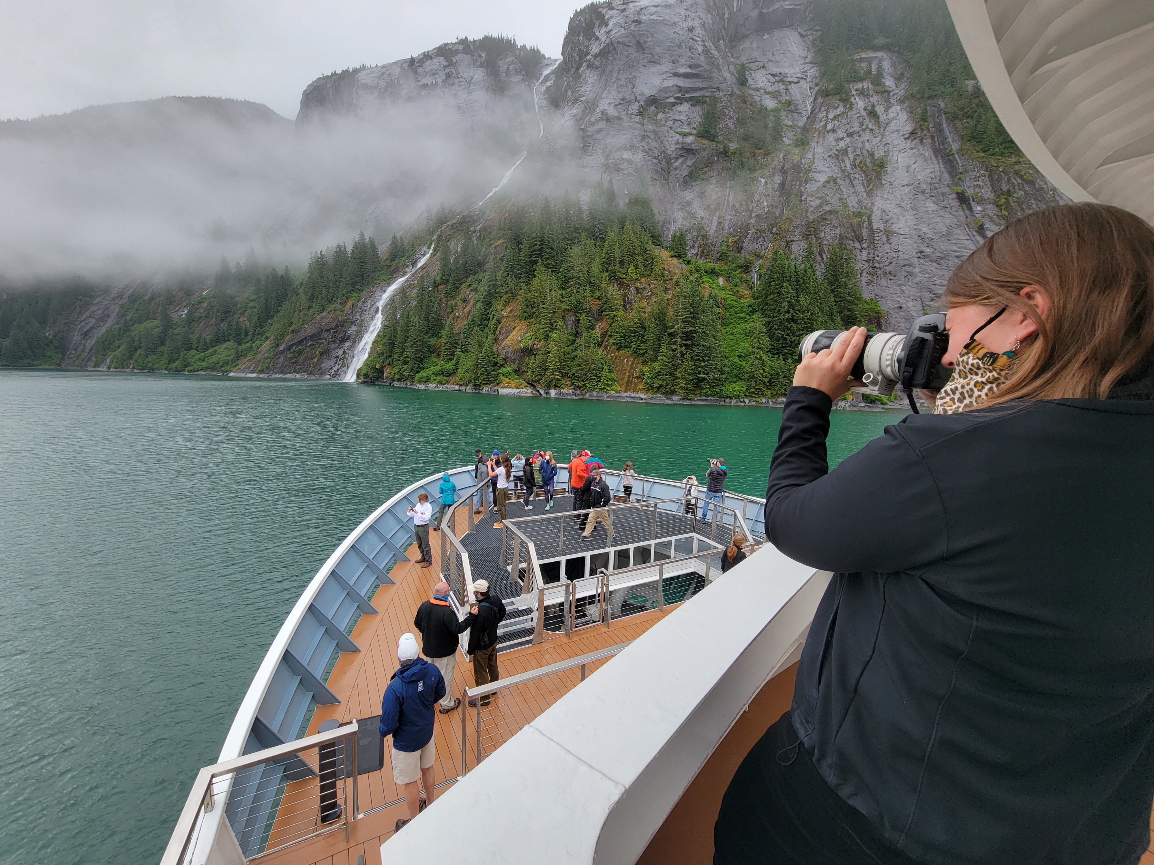 As we woke up on our first morning in Southeast Alaska, we found ourselves shrouded in fog, with dark mountains fading up into the clouds. It was quiet as the occasional piece of ice floated by, and the ethereal mood of the morning mists compelled us all to come out and visit the bow. Waterfalls wandered down the mountains, and the number of ice pieces floating by increased.