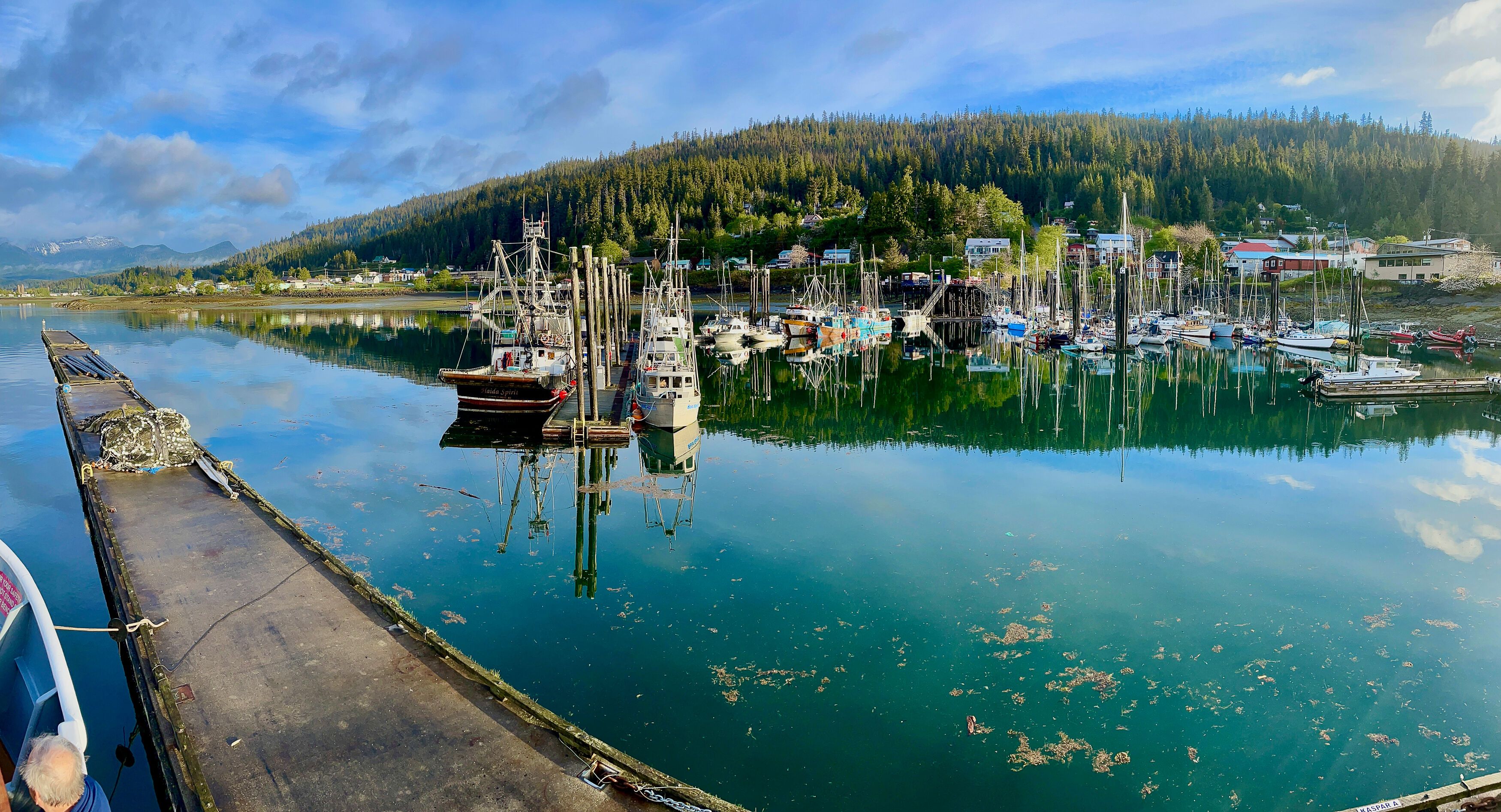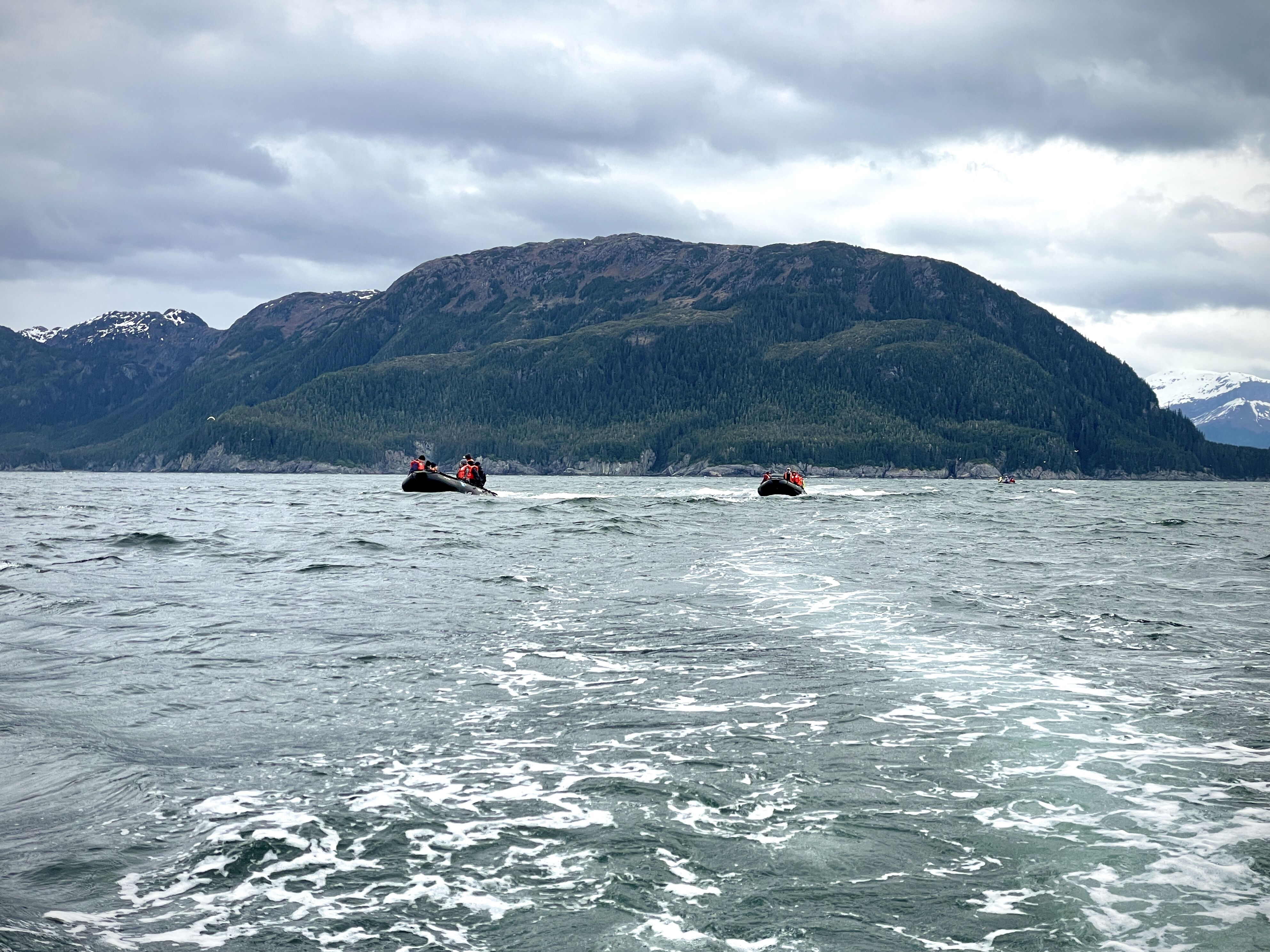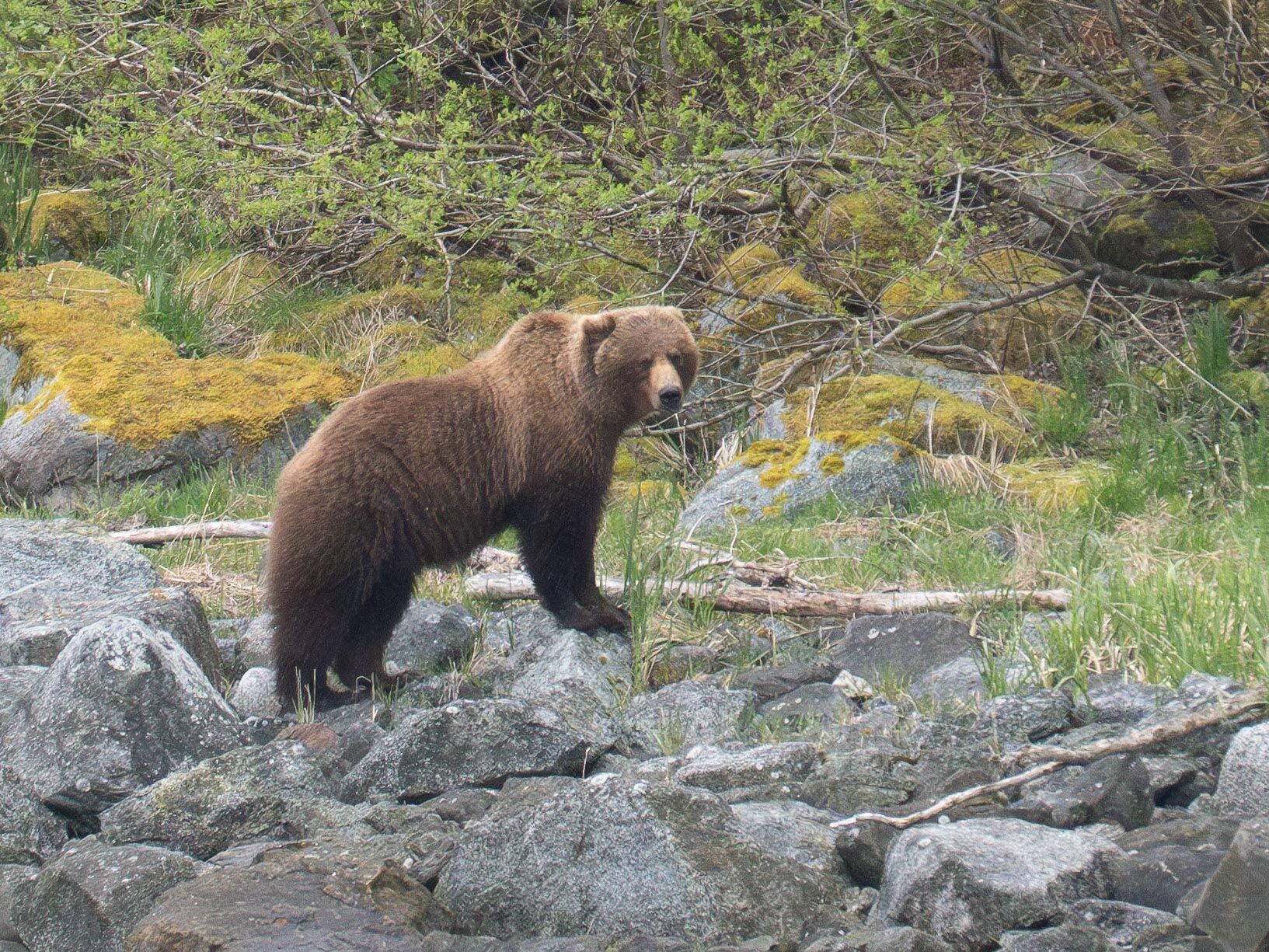 Ice was today’s theme. Although the air was crisp, we were all smiles as we cruised towards the face of a magnificent tidewater glacier resplendent in dazzling blues. The end point of Endicott Arm, Dawes Glacier is the source of ice for many harbor seal females that are weeks away from the start of their pupping season. Gulls, mountain goats, orange-crowned warblers, and black oystercatchers stood out against towering walls, and Sitka alders painted swaths of green along the ledges where no other trees could gain a foothold. Even on barren rock, life finds a way.