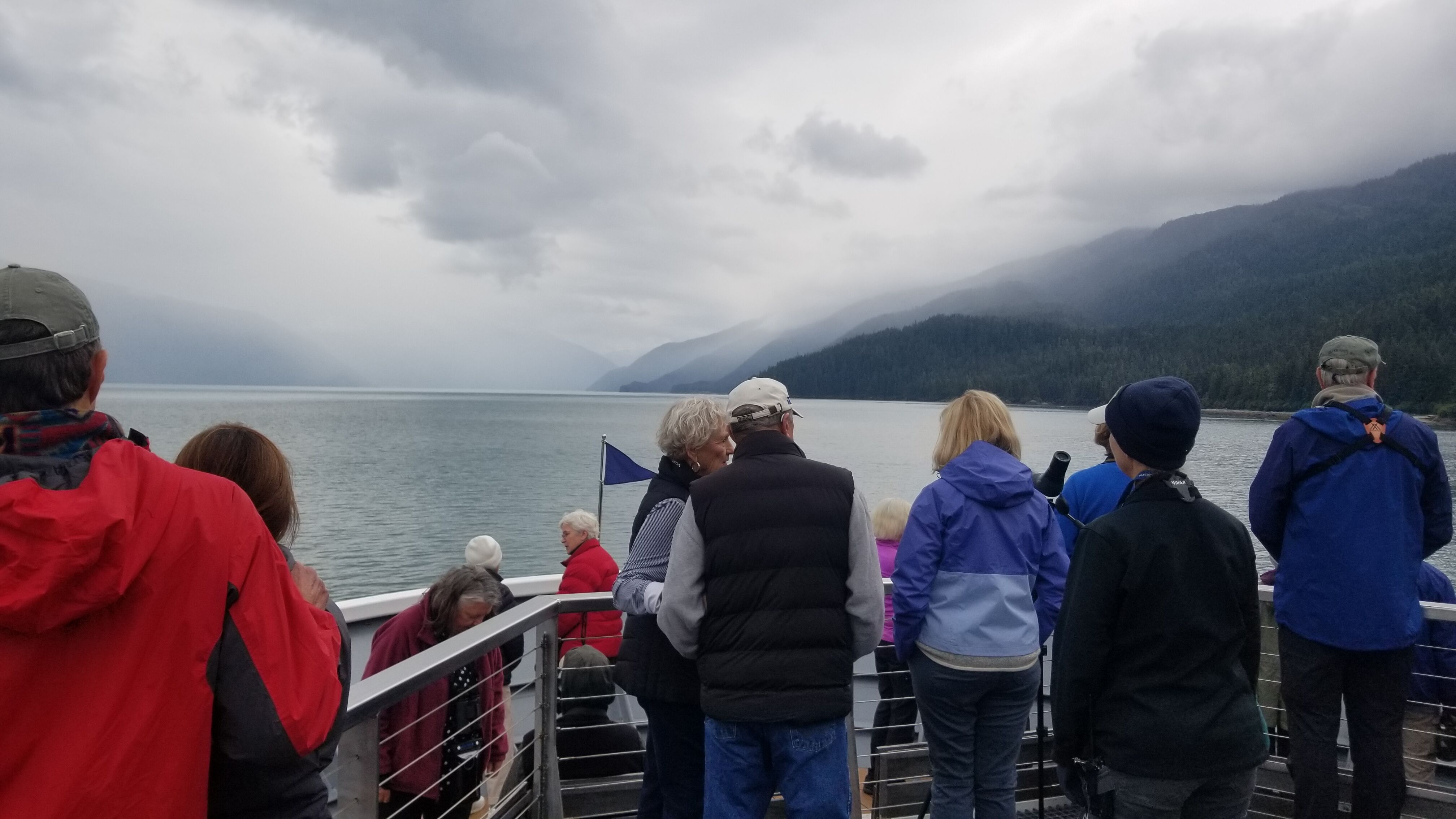 This morning, we awoke next to Five Fingers Lighthouse surrounded by humpback whales. We doubled back north towards Holkham Bay, watching the whales as they passed. Shortly after breakfast and passing through Holkham Bay and into Endicott Arm, we found a group of three killer whales. We were all heading in the same direction towards the face of Dawes Glacier.