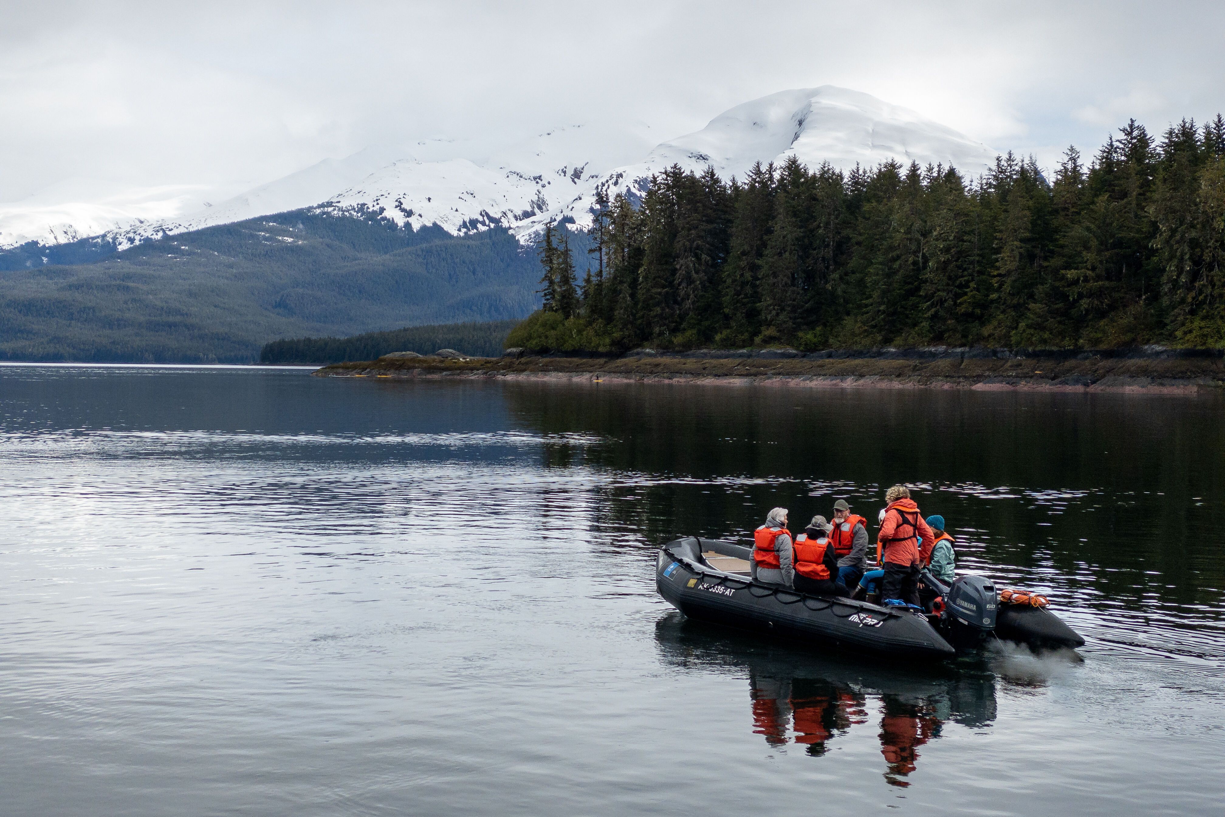 Today National Geographic Venture headed down Endicott Arm inside the Tracy Arm-Fords Terror Wilderness area. The day began with kayak ops and Zodiac tours in the tranquil Sanford Cove. Guests explored the intertidal zone of the cove’s rock faces. We then lifted anchor and headed further down Endicott Arm. We dropped our Zodiacs to explore the ice floe that comes off Dawes Glacier at the back of the fjord.