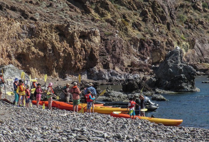 Relatively small and low compared to neighboring Santa Cruz, North Seymour is located to the north of Baltra. The island is dry with predominantly low shrubs, like prickly pear cacti. The incense trees are bare during the dry season. Seabirds like frigatebirds and blue-footed boobies nest on the island, and sea lions rest on the sand when they are not fishing. Land and marine iguanas also live here. Rabida is in the middle of the archipelago and has a striking red sand beach. We observed a small colony of sea lions of all ages resting or nursing. Behind the beach, American flamingos nest in a brackish lagoon. This island is full of contrasts and wildlife that we enjoyed observing during this day of expedition.