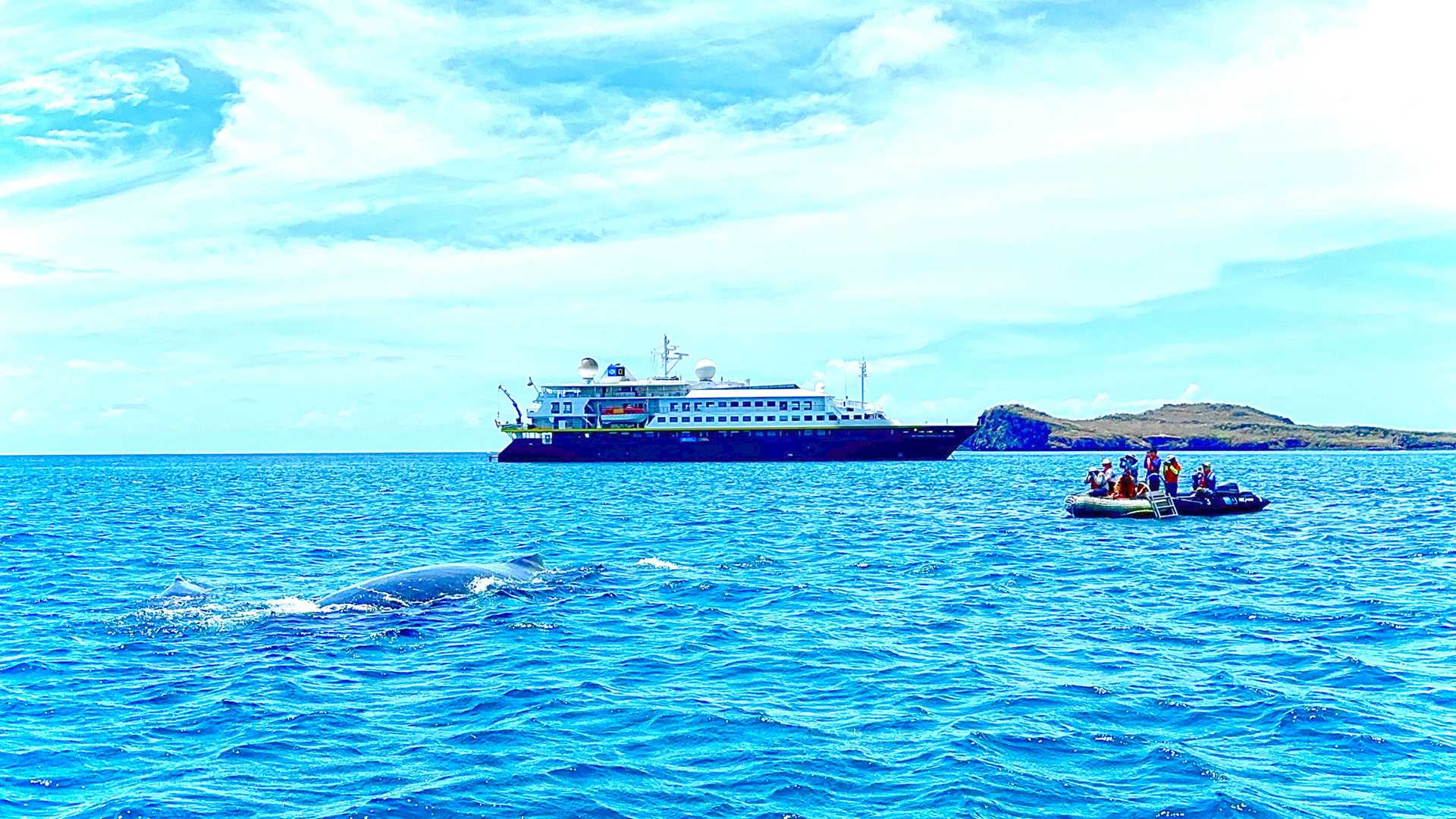 In the morning we explored the turquoise waters and white sandy beaches of Gardner Bay, where a big colony of Galapagos sea lions were basking under the warm equatorial sun. We disembarked on the beach to explore further. It really is a great experience to sit close to sea lions and be part of their lives, to understand their social structure and how they communicate with each other. We also explored the coastline by kayaking and snorkeling. Snorkeling here is a fantastic activity; playing among sea lions, tropical fish, and other marine creatures is certainly one of the greatest experiences of our trip. Then the greatest gift of our day was the unexpected whale show: a big mother humpback whale and her calf came very close to the beach in shallow waters. To have them so close was a memorable experience.