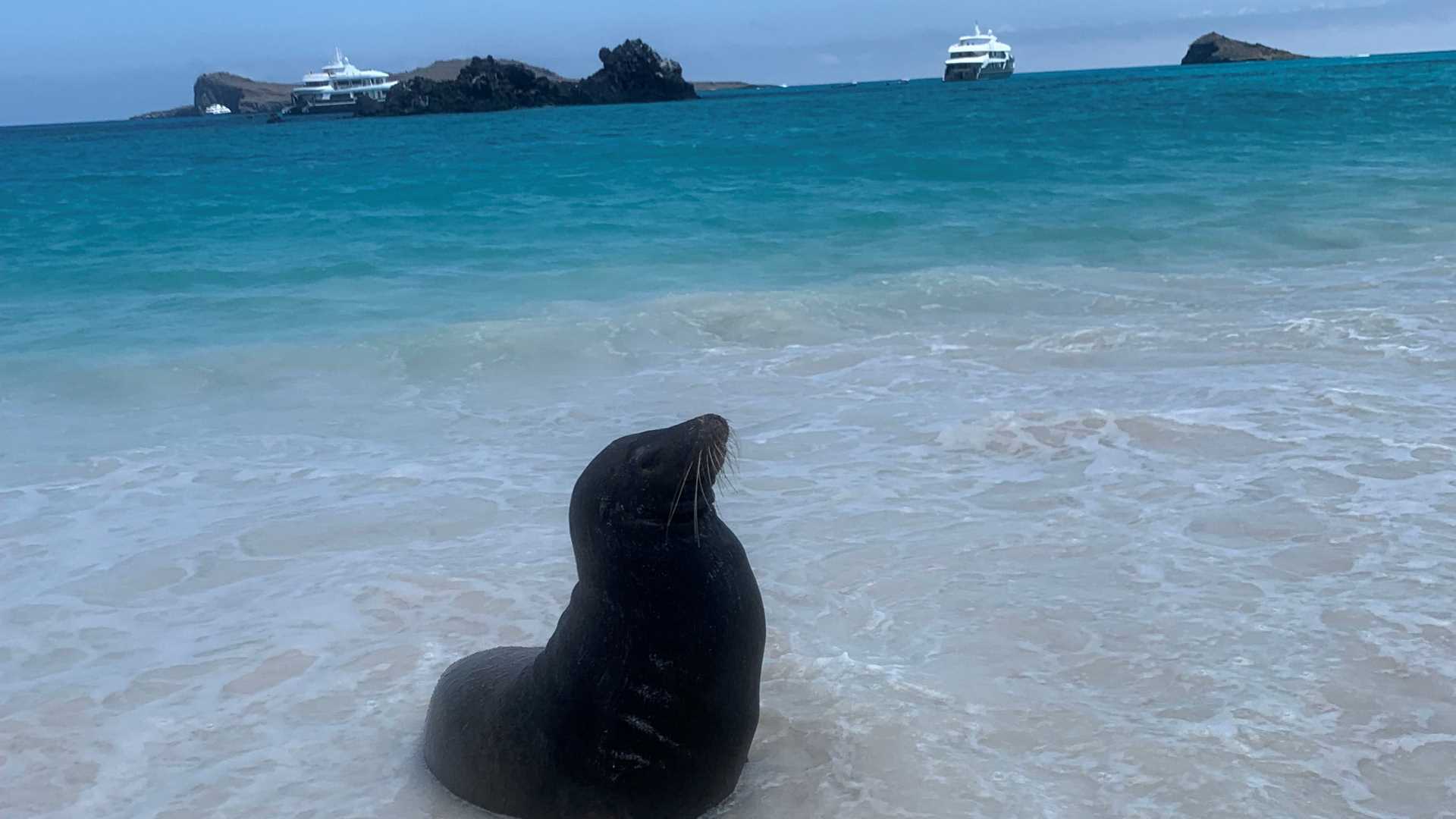 Our day in the Galapagos began at Punta Pitt, where we made a wet landing on volcanic sand, greeted immediately by a baby sea lion and a white morph red-footed booby at the shore. We started our ascent up the hill, spotting numerous red-footed boobies along the way and even a blue-footed booby! The landscape was breathtaking, with vibrant red hues in the vegetation and layers of orange tuff stone creating a stunning backdrop. In the afternoon, we explored Cerro Brujo on the western side of San Cristobal Island. After landing on semi-volcanic sand, we strolled among large colonies of sea lions, leading us to a stretch of pure, powdery white sand. We joined our wellness specialist for a stretching session, then walked along the beautiful beach, marveling at the unique volcanic landscape around us. Before the sun set, we returned to National Geographic Islander II and our captain took us to Kicker Rock, an iconic eroded ash cone and a nesting site for many seabirds. With the rock glowing in the evening light, our guests raised a final toast to celebrate an unforgettable day in this extraordinary place.