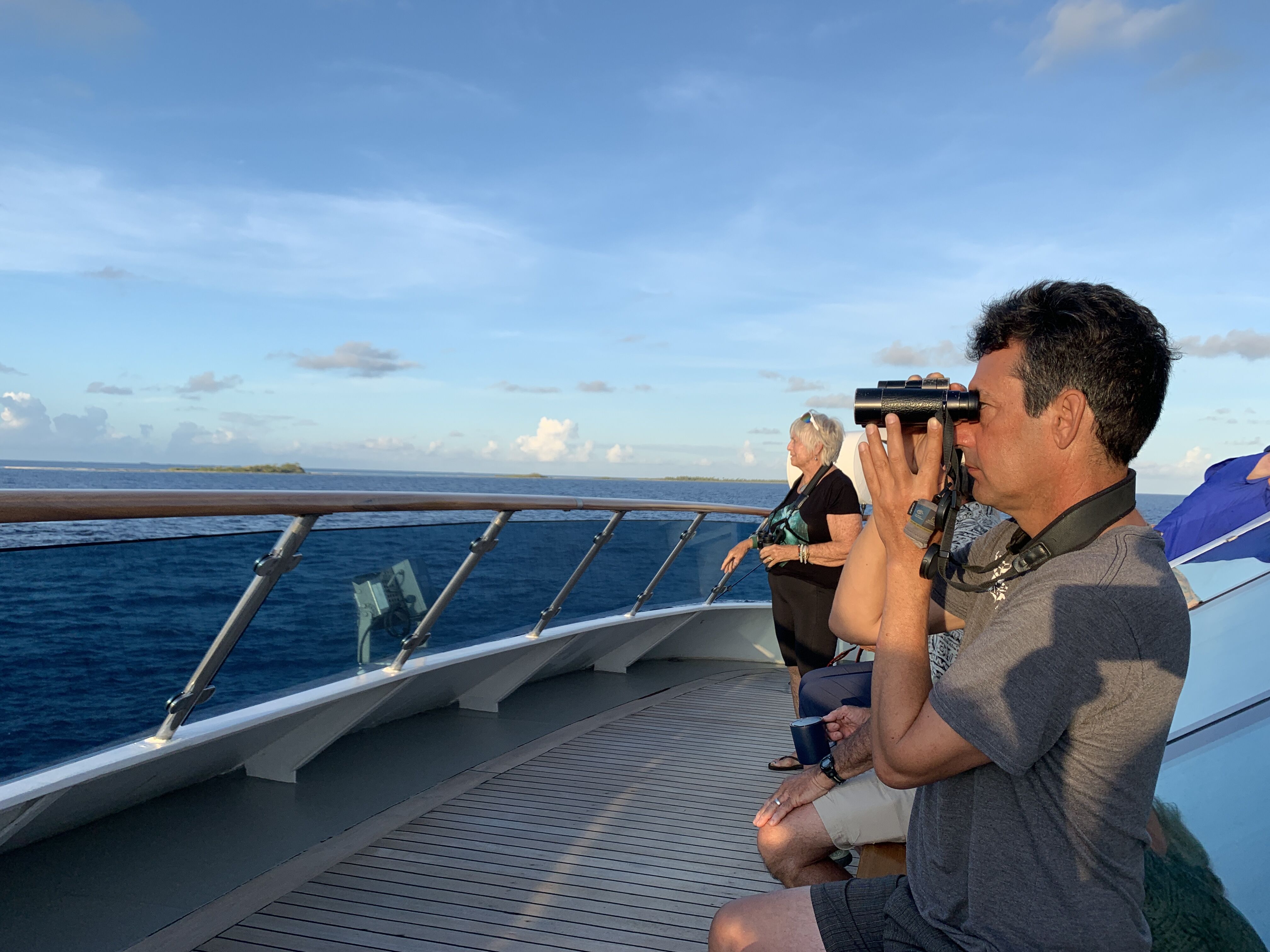 Entering the pass of an atoll in French Polynesia is always a beautiful way to start the day. This morning we arrived at Tahanea, a small island with no permanent population. The water here is some of the clearest our staff have ever seen in this region. With winds and currents to contend with, our divers found a beautiful site to spend some time underwater. They enjoyed a healthy coral reef, some sharks, and large fish. On their way back to the ship they even found some manta rays and jumped in the water to snorkel with them. The rest of us split into two groups: the hikers and the swimmers. The hike ashore was full of birds and plants to observe and photograph. The swimmers launched from the snorkel platform into crystal water where they poked around the coral heads and grew even more comfortable swimming with reef sharks. We had an afternoon aboard. We began with a presentation by our guest speaker Tom Ritchie about the most useful plants in Polynesia. At tea time, the hotel team put out 13 different sweet treats, not to mention the sandwiches and fruit. Before recap, undersea specialist James Hyde gave us a condensed history of the natural world—starting with the big bang! Tomorrow will be a busy day for us as we transit to some islands we have never visited before. So it’s quiet on board this evening as we all head to bed to rest up for whatever tomorrow has in store.