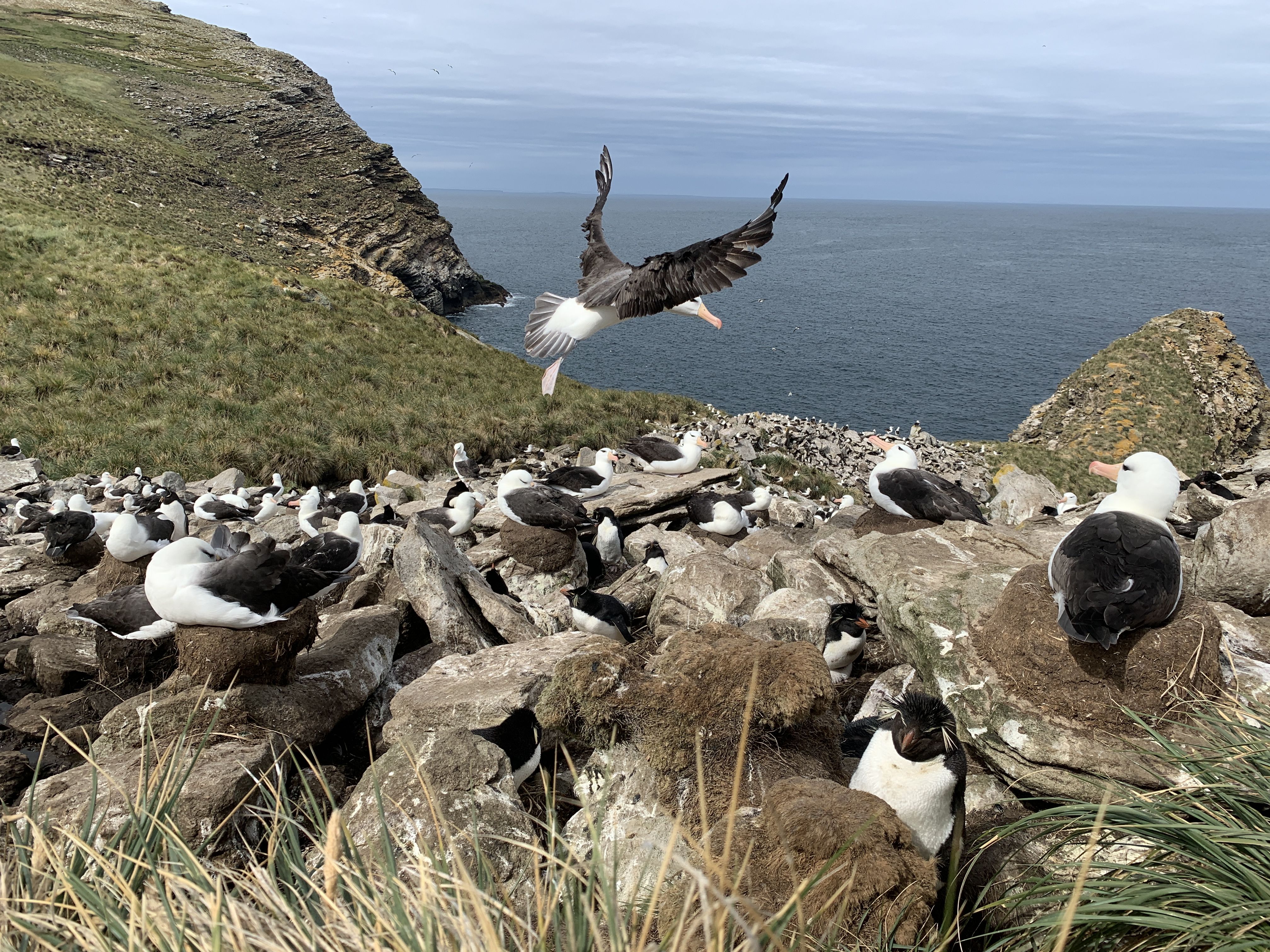 We hiked past the green and white homestead—with its beautiful flower and vegetable gardens—and then across the island to reach the famous black-browed albatross colony. By hiking through the tussac grass, we could stand near the tall mud nests that these birds build so meticulously. After watching these albatrosses at sea for nearly three weeks, it was a thrill to observe them up close, to listen to their calls, and to observe their nesting behaviour. There are many eggs in the colony!