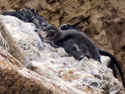 After breakfast, we headed to Fernandina Island. It was cloudy, windy and wavy, and near the shore we observed flightless cormorants, sea lions and sea turtles swimming indifferently among on the rocks. In contrast, the petrified marine iguanas still remained together, warming each other with their bodies due to the lack of sun. The volcano stood tall in the background, looking gigantic with its solidified black lava flows, mute evidence of recent eruptions. Walking along the white beaches, we observed several baby Galapagos sea lions and on the rocks, flightless cormorants enchanted our guests with their elaborate courtship dance. We were very fortunate, because we even observed a couple mating. Just before the end of the visit, our guests observed a Galapagos snake—it was close to us, unperturbed and moving slowly among the rocks. What an experience! But the attractions didn’t end there. Walking back to the small dock to return to the National Geographic Endeavour, we observed the spray produce by a whale that swam along Bolivar channel.