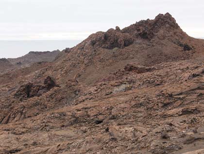 It’s early in the morning, overcast, but one can still see the silhouette of the impressive and young volcanoes of the western realm of the Galápagos.