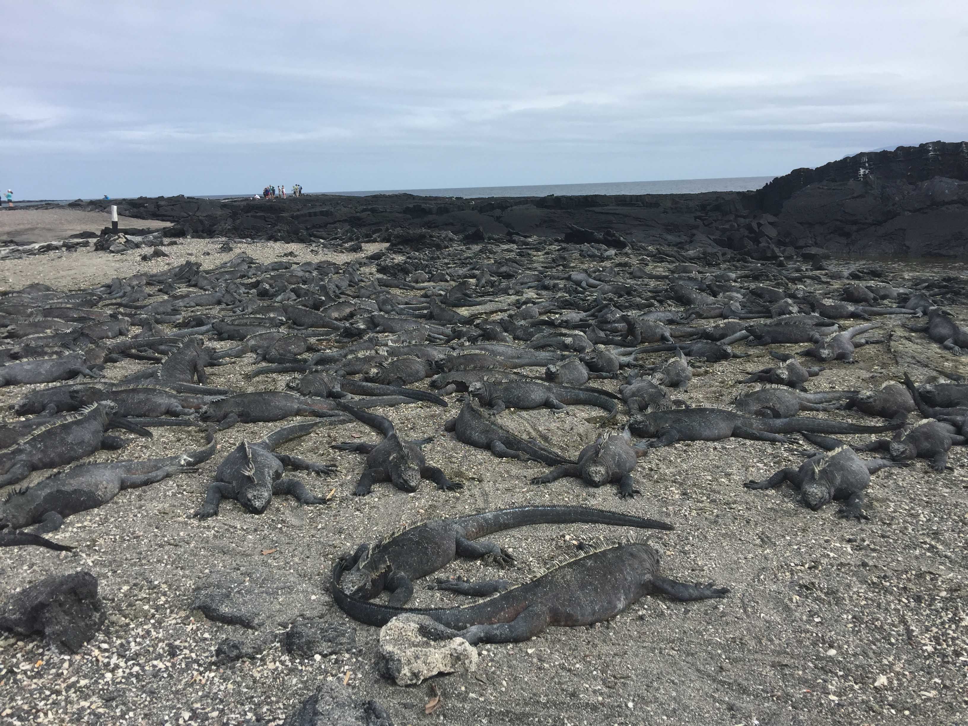 Today we visited Fernandina Island, our youngest and pristine island. It has only one visitor site and after a dry landing, we walked on lava until we reached an area that was uplifted in 1973. There is an engine block exposed to the sunlight of a boat that sank in the early 1900s. We saw very dark marine iguanas, young sea lions and flightless cormorants. After the visit, we snorkeled with marine turtles and spotted iguanas feeding underwater.