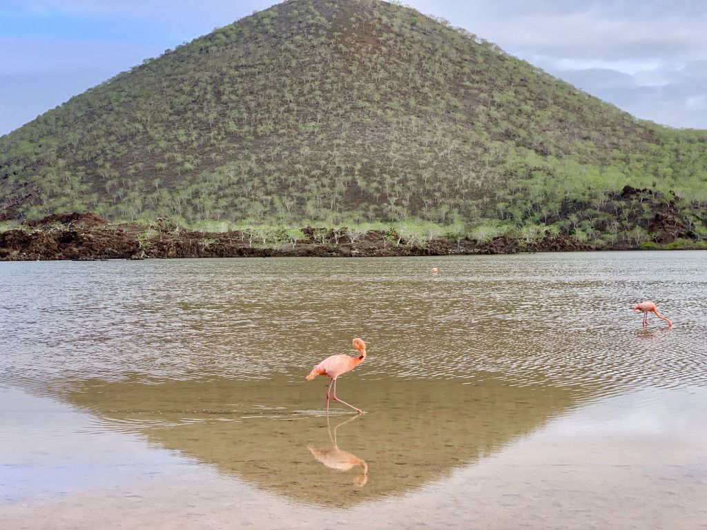 We are halfway through our expedition on National Geographic Endeavour II, and it has been an incredible experience so far. Today we anchored in a place call Punta Cormorant. We started the day with an early wet landing on a green sand beach. The beach has this coloration due to pieces of a mineral named olivine. This mineral is the primary component of the Earth’s upper mantle. As we explored the island, we found blue-footed boobies on the cliffs and flamingos eating in the lagoon. We had the chance to see dolphins later in the morning, and we enjoyed a great kayaking in Baroness Bay with many turtles.