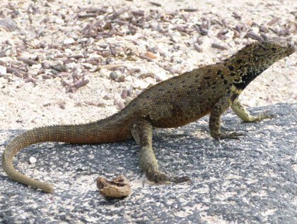 In the early hours of the day we disembarked on Punta Cormorant on Floreana Island. This was the first island that was colonized by Ecuador when the archipelago was claimed in 1832. As we landed on the green olivine beach of Punta Cormorant, we encountered a small group of greater flamingoes feeding on brine shrimp from a brackish water lagoon. After walking at the base of an extinct cinder cone, we reached the beach. There, we found a female green sea turtle in the process of covering her eggs. By accident she tossed away a baby sea turtle from a nearby nest; the newly hatched turtle went straight to the sea and swam away. We were all stunned by all this activity and after this walk, we returned aboard to have breakfast and to navigate to Champion Islet.