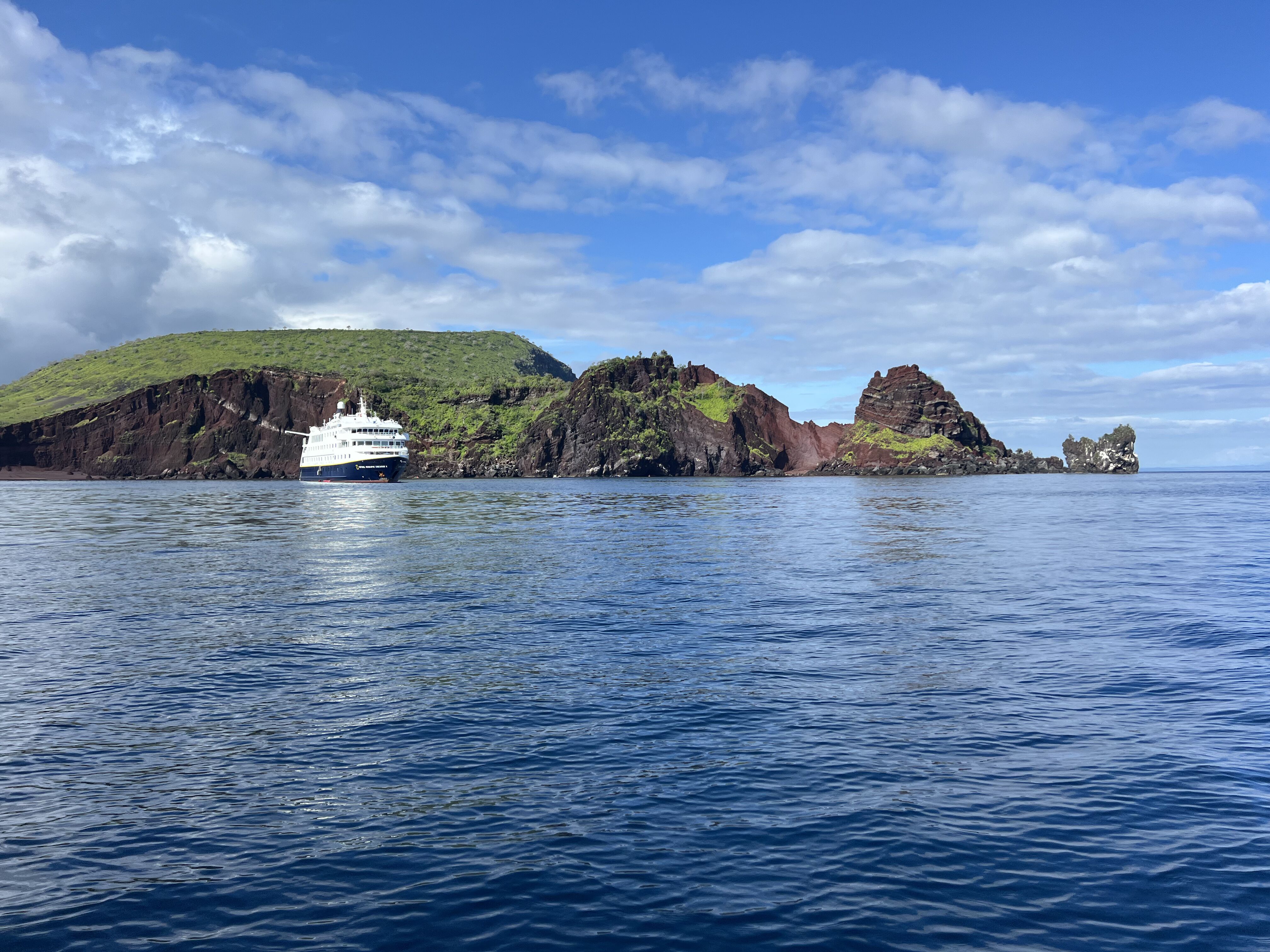 We started the day with excitement as we landed on the beautiful, pristine coast of Isla Genovesa - a true birder’s dream. Along the sandy beaches and steep cliffs of Darwin Bay, we were surrounded by an incredible array of birdlife. Frigatebirds soared closely overhead with their red pouches on full display, while Nazca and blue-footed boobies nested along the rocky ledges. Swallow-tailed gulls called out as we walked past. In the distance, we saw the stoic and elusive short-eared owl. The island was alive with color, sound, and constant movement. Between our excursions to Isla Genovesa, we snorkeled near Prince Philip’s Steps and discovered a vibrant world beneath the waves. Schools of fish swirled around us, a fur seal turned in the water as if dancing on cue, and sea lions relaxed nearby. As our last snorkeling adventure came to a close, we spotted a sea turtle resting calmly in a crevice. As the sun retreated into the sky on our last return to National Geographic Endeavor II, we reflected on the sheer magnitude of what we witnessed on our last full day. Isla Genovesa, like the other islands, gave us a connection to a sacred world. The harmony between land, sea, and sky reminded us how deeply interconnected, vital, and fragile these ecosystems are. Watching birds tend to their nests and marine life swim effortlessly, we were struck by how little space there is between wonder and reverence. We recognized that our journey wasn’t just about observing unique wildlife, it was about feeling part of something grander and beautifully ancient.