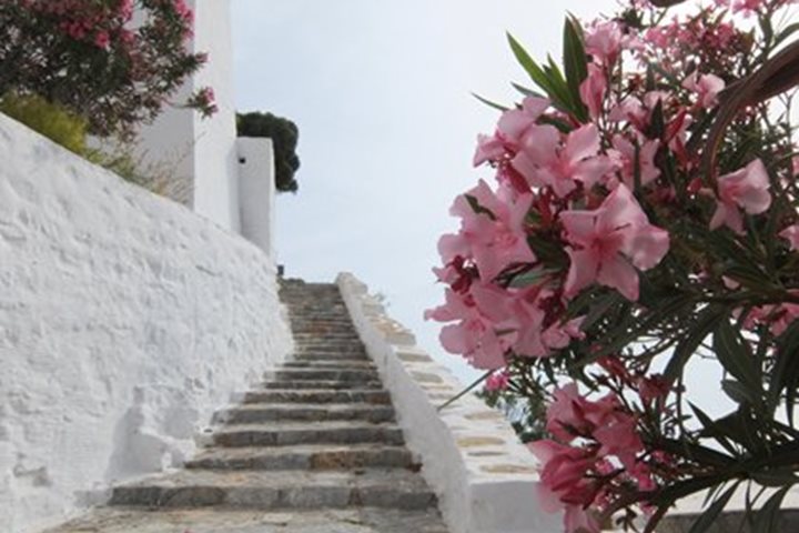 Approaching the Chora from the port, the first thing one sees is the spectacular whitewashed church of Koimisis tis Theorokou, or Dormition of the Mother of God, dominating the town on the high cliff where the ancient settlement first stood. A large party from our group climbed to the top to enjoy the view, to visit the church and to find out that on Easter Sunday the chief icon is carried through the town. We all visited the town. Today Chora—small, white, old, and well preserved—is the main reason to visit the island. Its main street meanders through five little squares, each with a few restaurants and cafes shaded by a few trees and bougainvilleas. The highlight is the Kastro built by the Venetians in the 13th century. The Kastro, the fort, is strikingly lined with two-story cube houses that form a wall atop the towering cliff. We strolled through the quiet town, admired the wise folk architecture and visited a church. We then sat in the shade of the trees of the square and enjoyed rakomelo—a local liqueur.