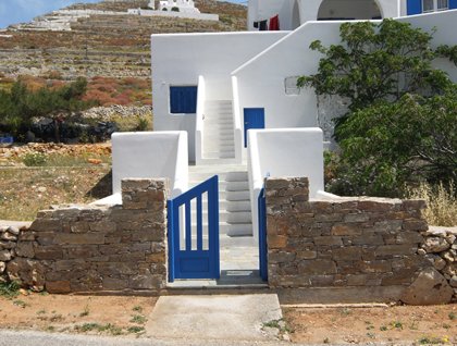 Folegandros means hard, iron-like stone, a name given to it because it is a dry, barren and rocky, mountainous island! Upon arrival by sea one sees the three large rocks—one succeeding the other—on the top of which is a church dedicated to Virgin Mary Kardiani, of the heart.