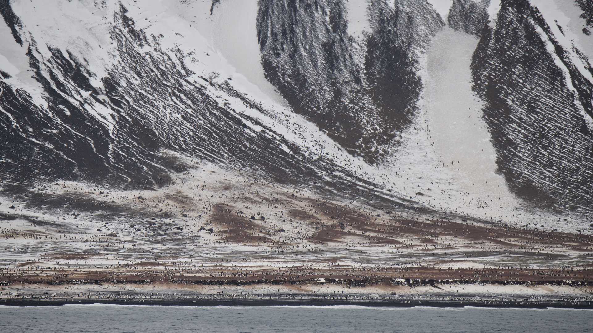 The green light from the scout party was given, and we headed for our morning adventure. What we experienced during the morning on this remote island was nothing short of wondrous: Adelié penguins with chicks in creches, most fully fledged and preparing for their new lives at sea. Parents piled up on the shoreline and headed for their feeding grounds in large waves.