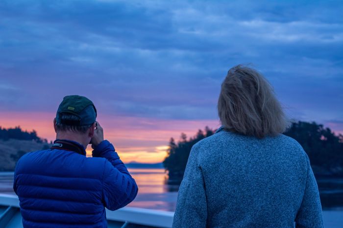 On the last day of our exploration through the Inside Passage of the Alexander Archipelago, National Geographic Quest crossed over the Canadian-American border one last time. Waking up to a stunning sunrise, guests came out onto the bow to gaze at the coast of Spieden Island – a now-wildlife sanctuary previously a game reserve for hunting – watching Asian big-horn sheep and deer roam and graze in the morning light.