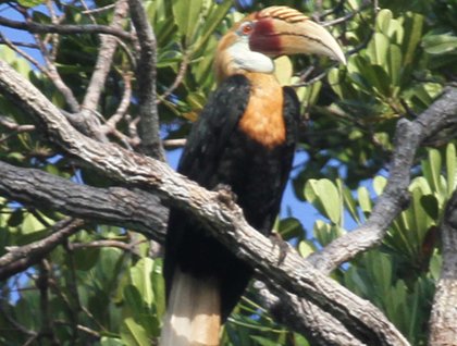 The dawn chorus was in full swing, with butcherbirds and friarbirds prominent. Parrots flew over squawking as they fanned out over the forest on their way to fruiting trees. And then the star of the show put in an appearance – several Blyth’s hornbills were found. These birds were watched using their long bills to pluck fruit from the outer branches of fig trees, the long reach enabling them to access fruit on branches that would not have supported their weight. And then with a dexterous toss they would flick the fruit back, catch and swallow. Then as they took flight their huge wings created a whooshing rush of air as they powered through the canopy.