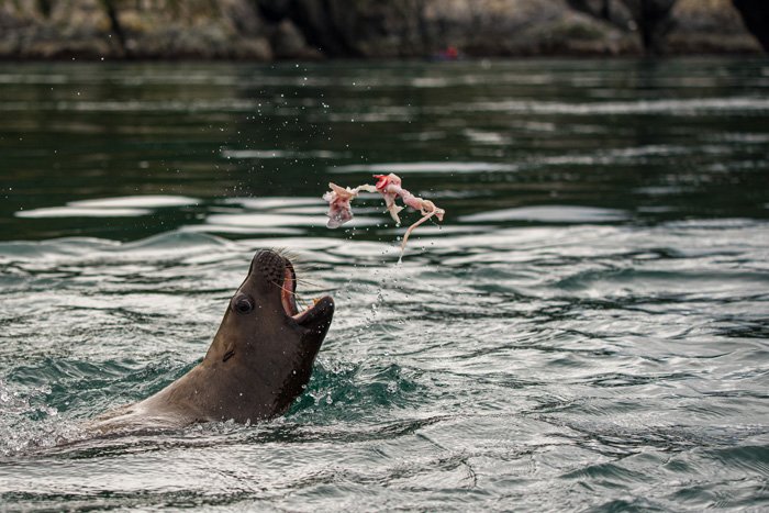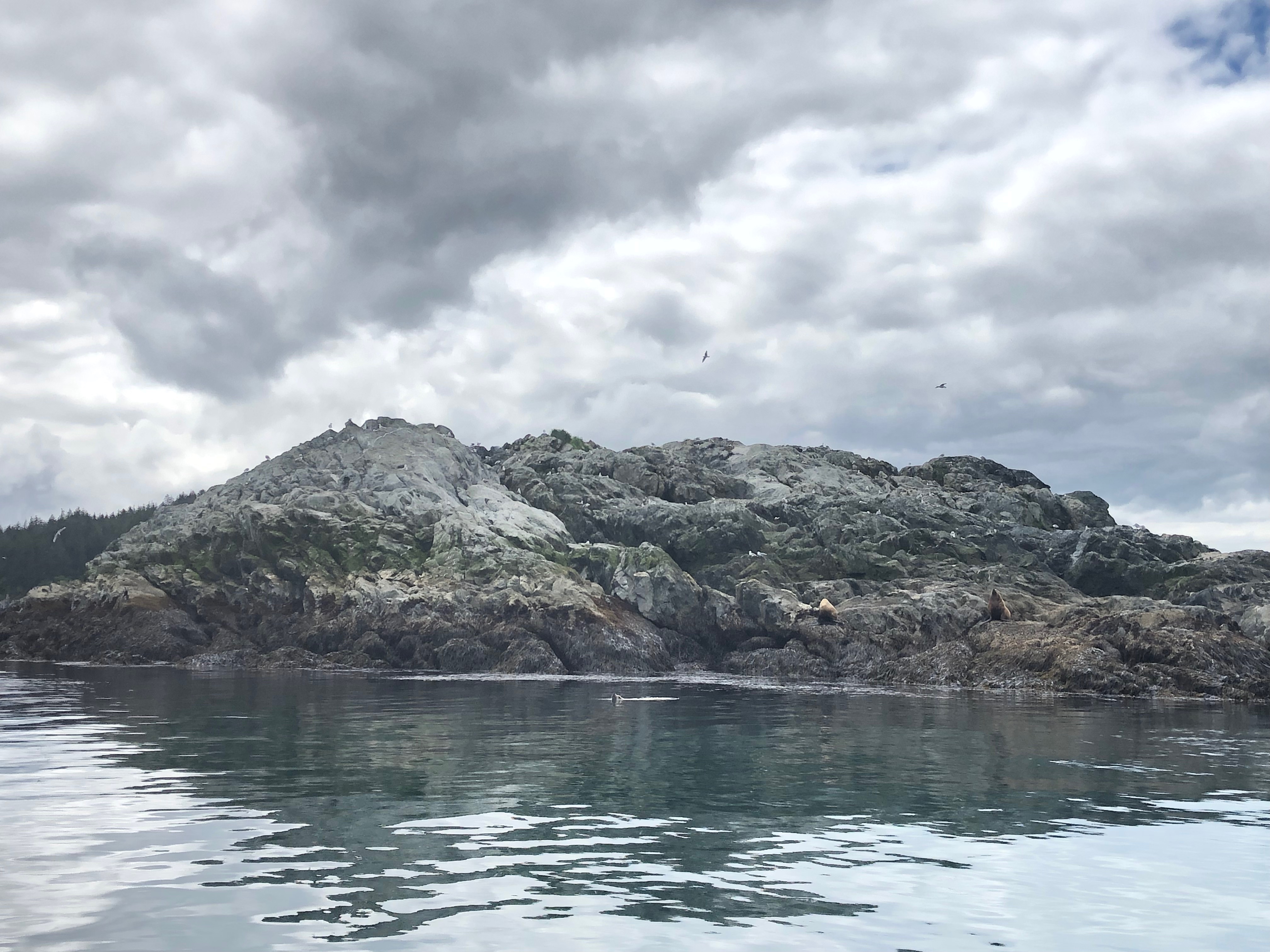 This area of Alaska is a mixing ground where open ocean swells enter the Inside Passage and the relatively confined inter island waters get a chance to flush and flow out to the expansive Northern Pacific. The cold, nutrient-rich deep water is upwelled via displacement by surface currents, creating prime feeding ground for various fish and the predators that feed on them. Among these hunters are Steller sea lions. We watched from our small boats as they lounged precariously on rocky coastline used as “haul-outs.” Their groans and seemingly awkward postures were as entertaining as they were fascinating.