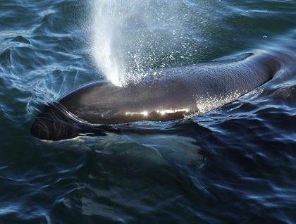 Later in the day came sightings of mountain goats, a nanny and kid, grazing the steep cliff sides of Gloomy Knob. We collectively held our breaths when the kid slipped and fell a few feet down a ravine. Tufted puffins and surf scoters colored the water at the base of the cliff, as they did also off South Marble Island – a chaos of sound, smell and action. Glaucous-winged gulls, kittiwakes and steller sea lions dominated the airwaves, while the photographers found sea otters, more puffins and murres. Earlier we had diverted from our course as a result of a call from the bridge indicating they had found a pod of killer whales ahead. Beautiful! The satin-smooth water rippled, and then split with the tip of a tall, dark and very handsome six-foot dorsal fin. The low light of afternoon backlit the exhaled air on one side of the ship; on the other, “rainblows” appeared to our delight. This group appeared to be resident killer whales, and we counted at least fifteen individuals making their relaxed way into Geike Inlet where we finally left them to their own, private plans and turned the ship back on course. We took walks in the forest of Bartlett Cove after dinner, which ended in the dim twilight of the oncoming autumn of Southeast Alaska.