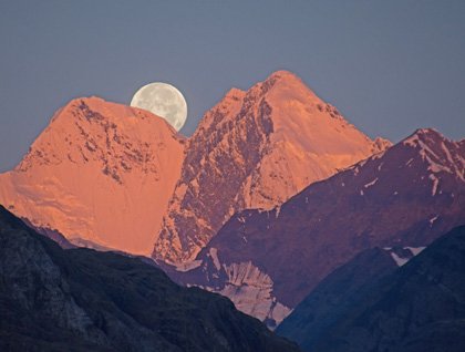 We entered the park after midnight and cruised northward through the night. At dawn photographers were glad to have arisen from their beds to witness the early morning light on the peaks reflected in the water of the bay. The full moon gave way to sunny skies and amazing scenery.