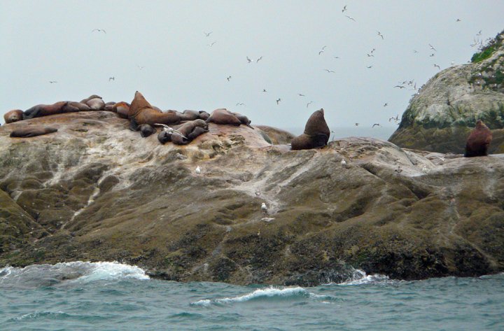 Most of Glacier Bay was buried under thick glacial ice 250 years ago. As we traveled 60 miles north into the bay today, we found abundant animal life ashore and in the water. We observed Steller sea lions, humpback whales, puffins, sea otters with pups, mountain goat nannies with tiny kids, and even sleeping brown bears. We also observed an unusual blond wolf foraging in the intertidal zone.