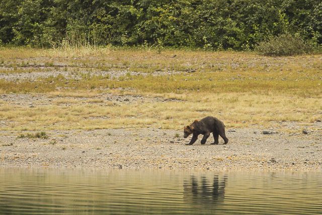 National Geographic Venture continued her journey north toward the end of the bay and entered the protected Tidal Inlet where we were able to get a very good view of a big male brown bear. A little while later, we spotted some more brown bears walking along the beach, and a sow with her two cubs. We watched them as they climbed a steep cliff and marveled at the ease and confidence of their movements. Not long after, we discovered a number of mountain goats resting and grazing the steel-gray rock faces of Gloomy Knob, followed by the discovery of a solitary male killer whale patrolling the waters of the bay. What a privilege to being able to admire such magnificent animals in the wild!