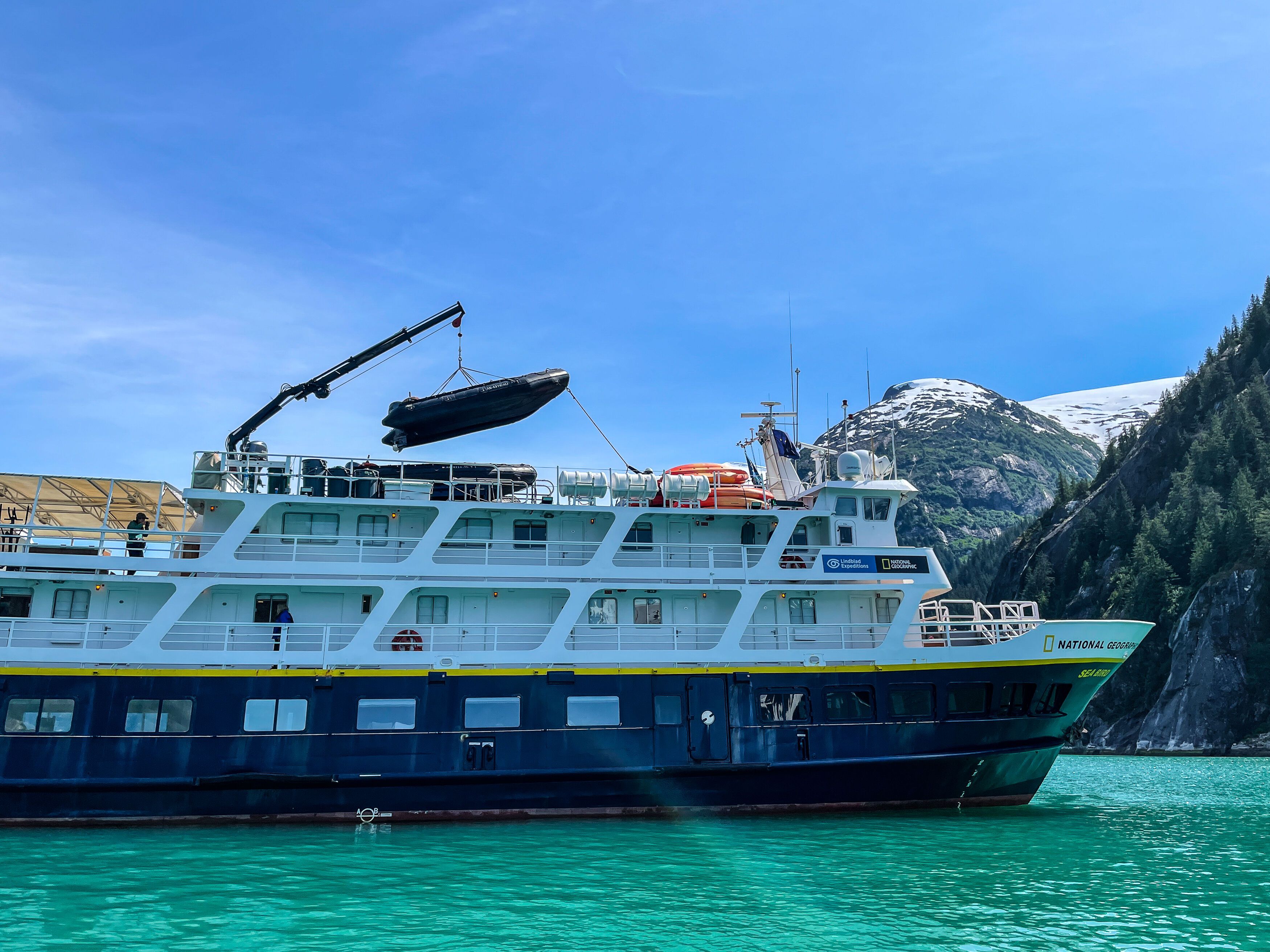 Today we woke to a beautiful, sunny day with gorgeous views of the snow-capped mountains flanking Tarr Inlet in Glacier Bay National Park. While enjoying a hot cup of coffee on the bow of National Geographic Quest, several Alaskan brown bears soon appeared off the portside by the rocky shoreline, including a mother bear with two cubs, as well as two huge male brown bears. At one point, the mother bear started running along the shoreline with her cubs for quite a distance, probably to keep the cubs safe from the large male bears. We enjoyed incredible views of brown bear behavior for over 30 minutes. Then, moving on to the end of Tarr Inlet, the Captain positioned the bow of National Geographic Quest facing Margerie Glacier, a tidewater glacier that calves into Tarr Inlet. We quietly listened to distant cracks and booms coming from inside the glacier as it slowly creeps towards its terminus, and a few blocks of ice calved off the left side of the terminus into the inlet. We had the privilege of having a Native Huna Tlingit woman come aboard to explain their culture, lifestyle, and spiritual connections to the land. It was a magical and emotional moment to quietly watch the morning unfold with Margerie Glacier spread across the bow of our vessel, while we listened to the soft beat of her hand-made drum and her songs to the earth, as she danced in her native robe with guests. Off the starboard side to the north, we saw morainal debris from the Grand Pacific and Ferris Glaciers at the end of Tarr Inlet, with glacial ice glistening in the distance.
