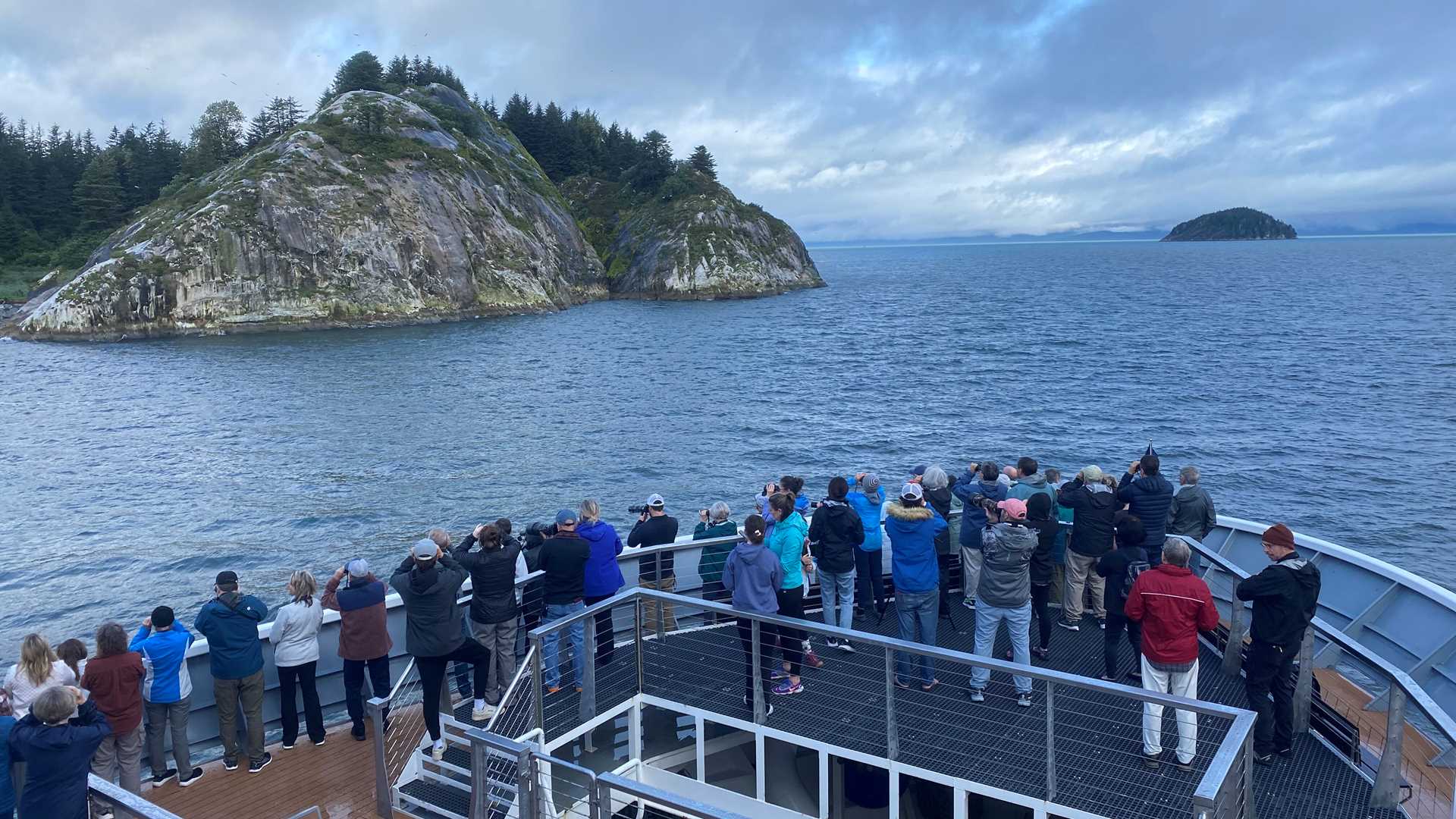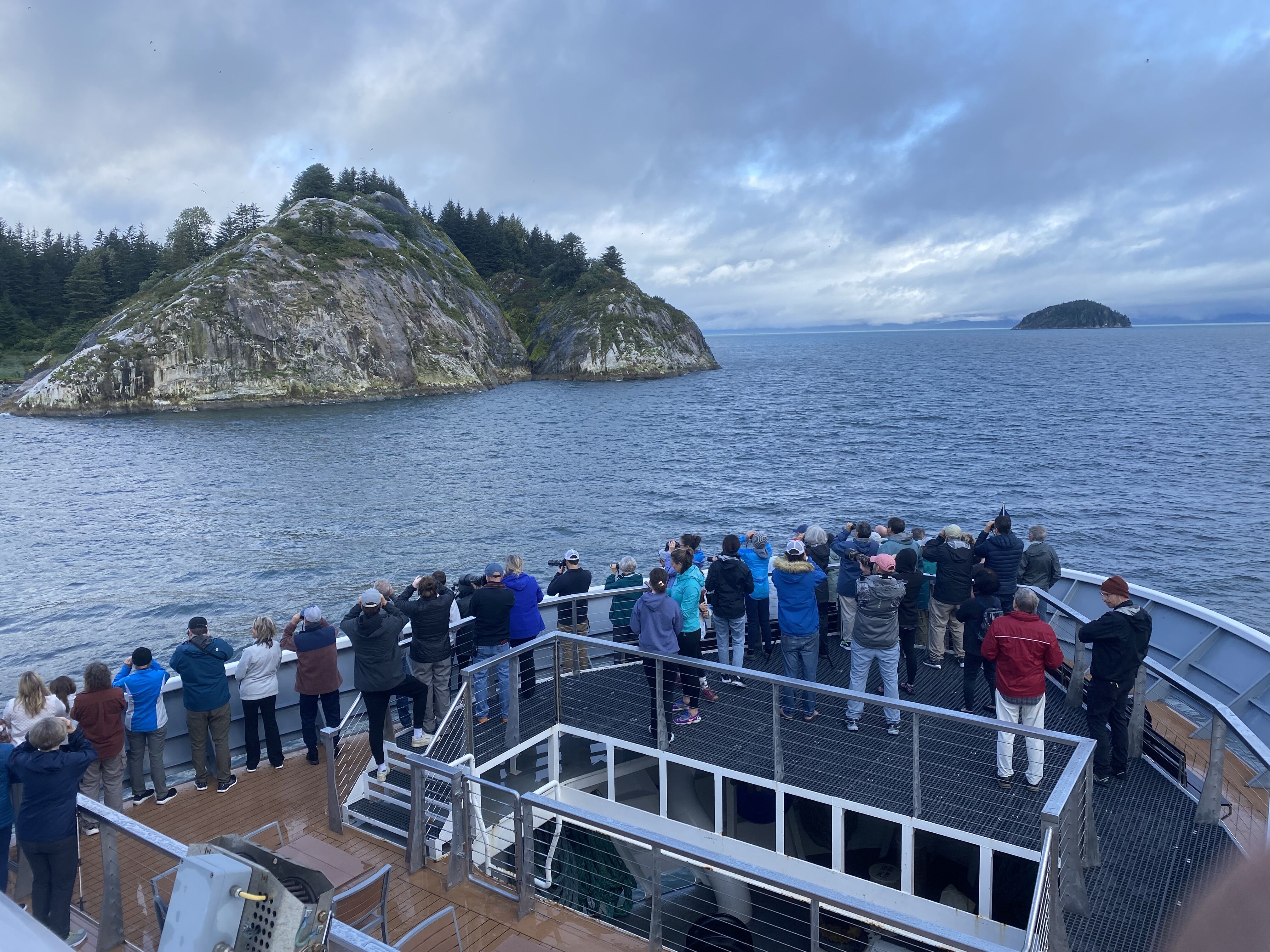 Today, National Geographic Quest explored Glacier Bay National Park. It was a beautiful partly sunny day with a lot of wildlife. We found several bears, and whales swam by to observe us. We even found a few rare species. We witnessed two peregrine falcons hunting, three hoary marmots, a moose, and horned puffins.