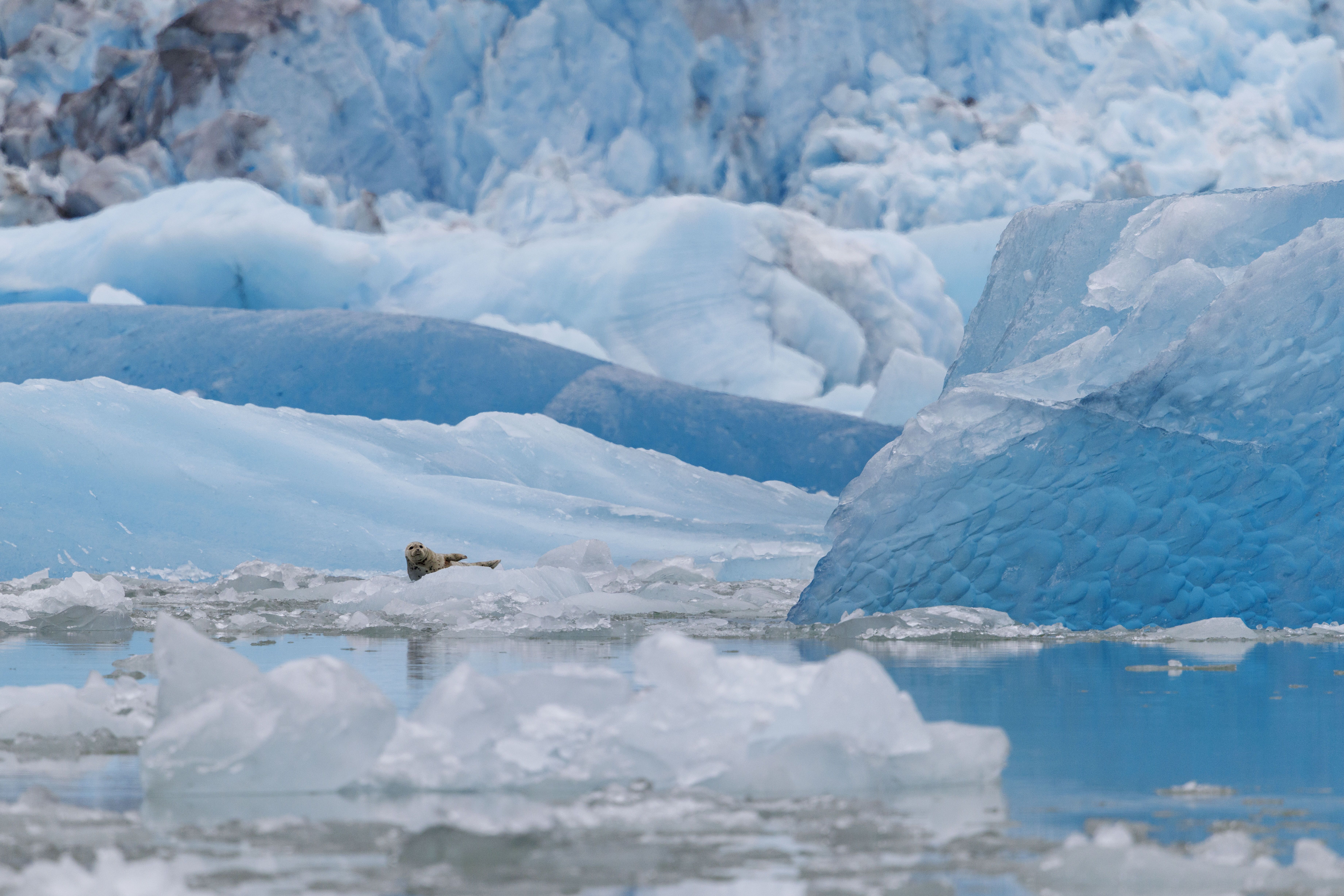 We awoke to a wall of ice towering outside of the ship. Sometime in the night we anchored alongside the monumental Johns Hopkins Glacier. Along the base of the glacier, hundreds of harbor seals lounged on the rafts of ice, and stunning mountain views accompanied the impressive natural feature for which the park was named. After eating breakfast with a glacial blue backdrop, we pulled anchor and began our exploration of the park in earnest. We visited several more glaciers, including prime examples of tidewater, hanging, and beached varieties; we also observed large numbers of sea otters and surf scoters. After lunch we turned our focus to wildlife and were rewarded with views of mountain goats on Gloomy Knob, as well as a brown bear excavating a comfortable resting spot on the beach. Later we were treated to a surprise concert by one of our guests (award winning musician Jim Peterick). We wrapped up the day with a visit to South Marble Island where dozens of tufted puffins and large rafts of Steller sea lions gave excellent views.
