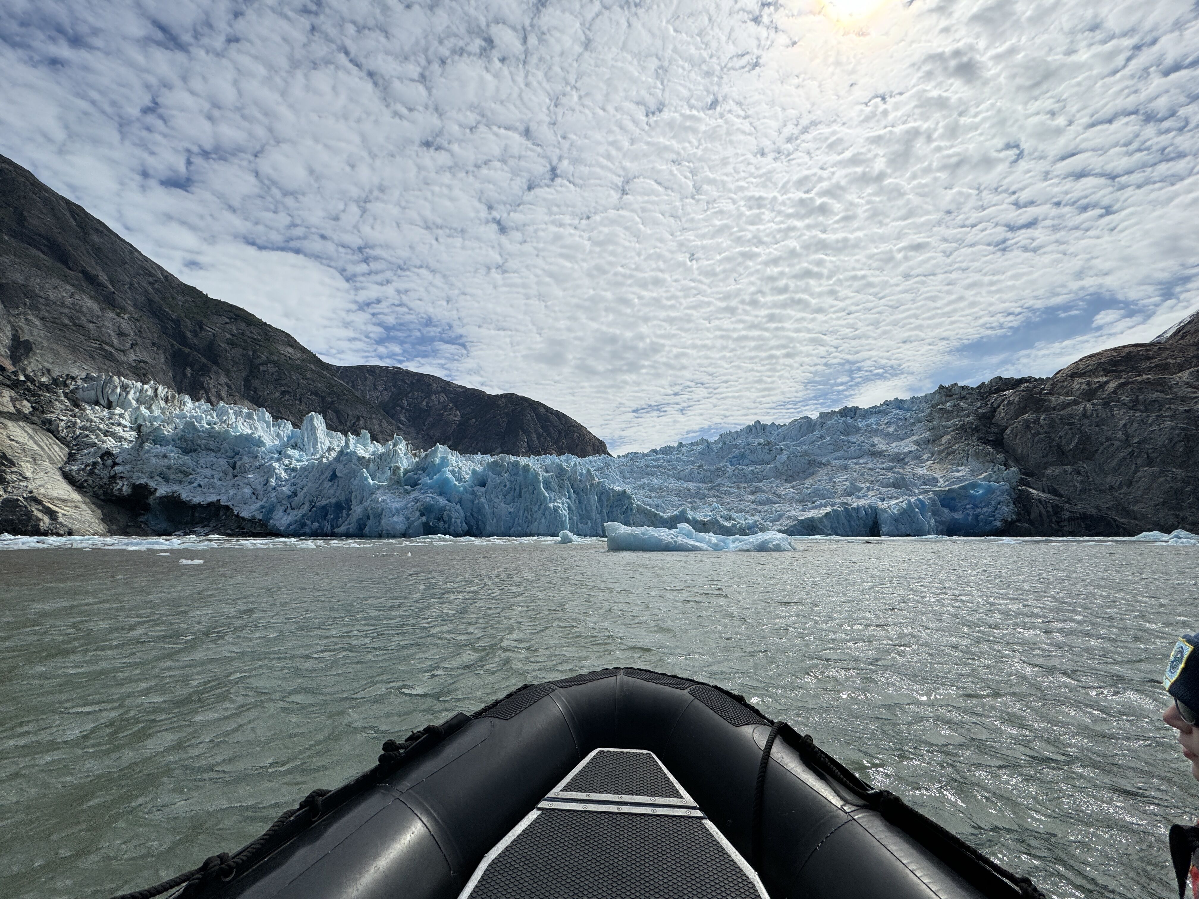 On the last full day of our voyage, we woke in Endicott Arm near the Dawes Glacier. We spent the morning enjoying Zodiac tours to the face of Dawes Glacier and watched multiple calving events. We were also able to spot several harbor seals, waterfalls, and a couple harbor porpoises on the way. After lunch we had the opportunity to participate in a polar plunge. Forty people decided to brave the frigid water for a short swim. Those of us not eager to jump into glacier water were able to watch from the bow. After the polar plunge, we warmed up on board as we started transiting towards Juneau. On the way, we stopped at a beautiful waterfall to once again admire the amazing natural beauty of Alaska. During our farewell recap, we were treated to a quick visit by a humpback whale. We ended our day with a slideshow made up of our favorite photos and memories of an amazing week on board National Geographic Quest .