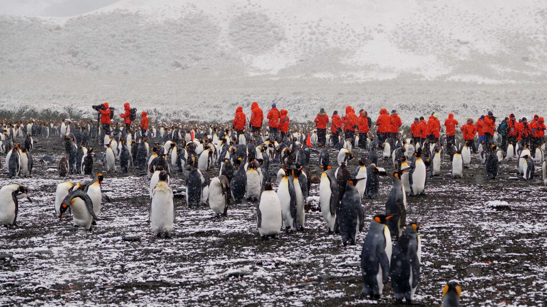 In our typical tradition, we began operations at Gold Harbour just as dawn was breaking over a stunning bight in the South Georgia shoreline. Snow showers and low clouds cast a dramatic atmosphere over this bustling shoreline, where over 30,000 pairs of king penguins and thousands of elephant and Antarctic fur seals gather to breed each year. It made for a thrilling start to the day. We spent the entire morning here, arranging an after-breakfast landing and hike for those who chose not to join us in the wee hours of the morning. With a marked improvement in the weather, the second morning landing truly made for a complete experience here. Hikers set out to explore the plateau that rises over the beaches and colony, while the rest of the guests took in the awe-inspiring sights and sounds of the third largest king penguin colony on South Georgia Island.