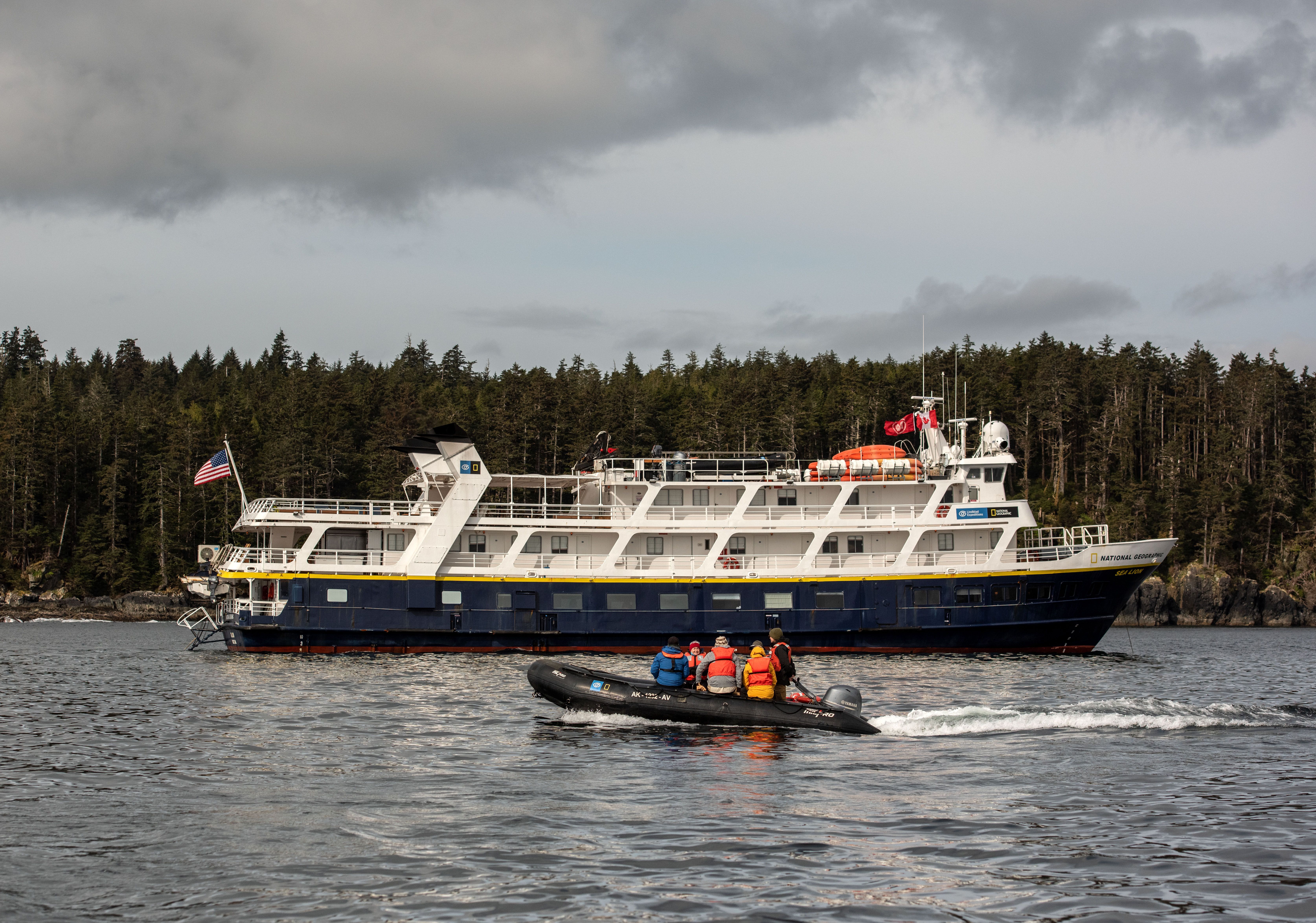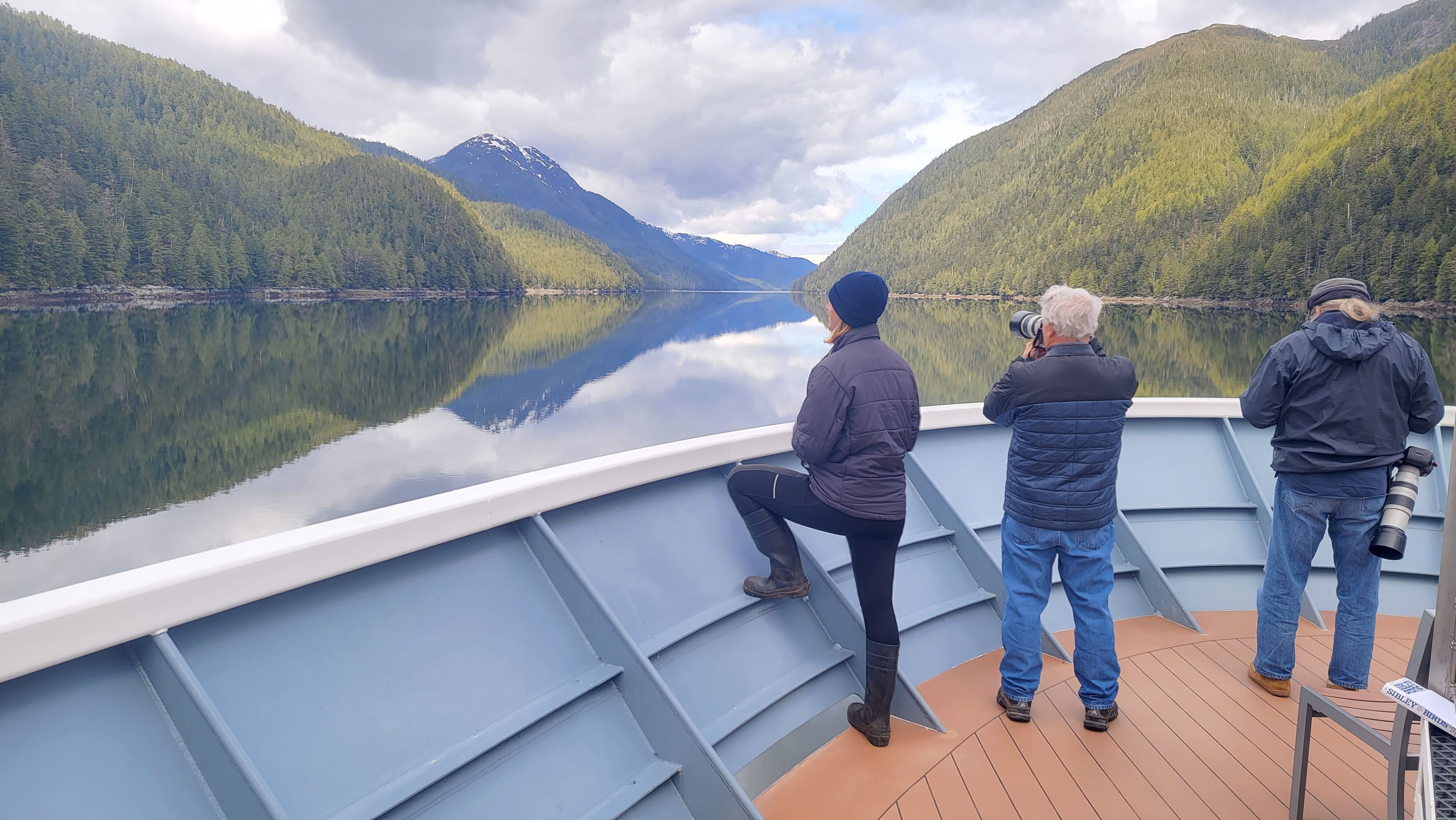 We woke up to crisp air and fog rolling in over the mountains. We grabbed all our layers and our binoculars and went out to the bow to look for spirit bears. It seems our luck was for one night only, and this morning we found ourselves viewing humpback whales. We were able to identify two of the humpback whales using the citizen science project website, Happy Whale, and learned that their names are Webb and Loner. Both whales had recently arrived from Hawaii! We spent some time enjoying the whales and then moved on to Klewnuggit Inlet.