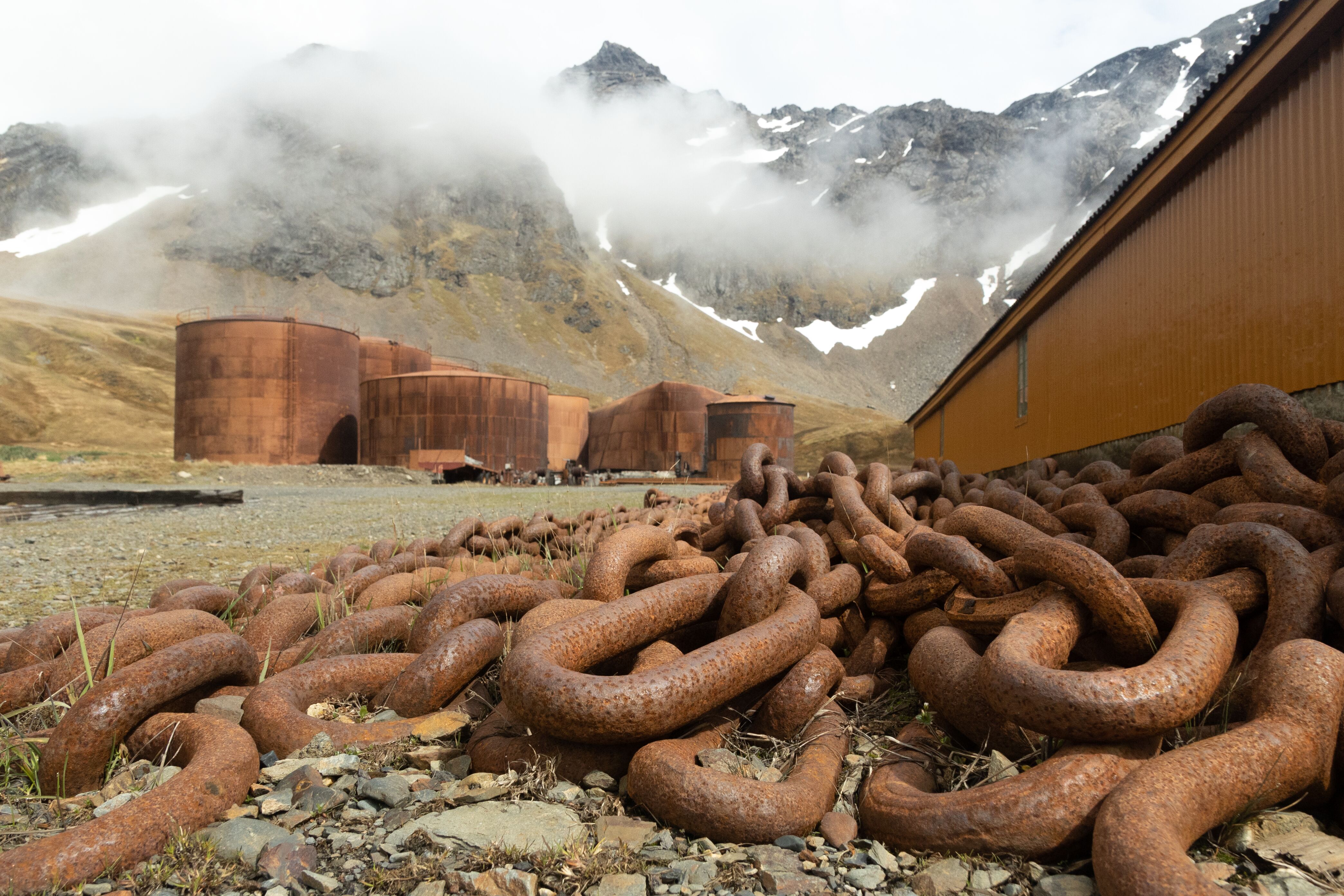 The sky perfectly reflected in the milky-green water as we entered the bay towards Grytviken this morning. Clouds hovered over the mountaintops, and as we beached the first couple of Zodiacs, the clouds lifted here and there, revealing the dramatic scenery behind the old whaling station.