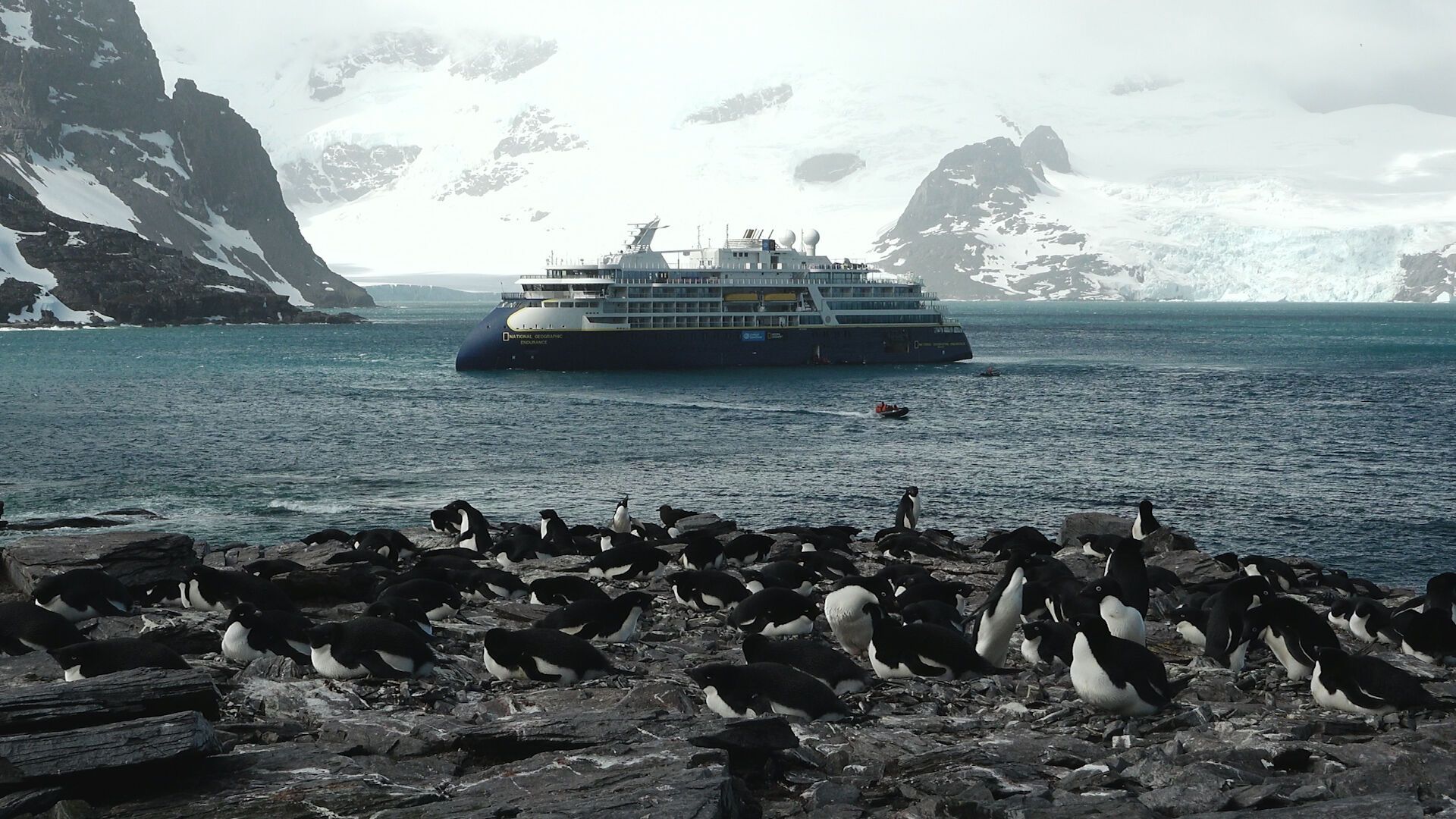A stubborn wind met us at our arrival to St. Andrews Bay, and the smell of the thousands of king penguins was solid. After several attempts to put our Zodiacs in the wavy water to take us to shore, our Expedition Leader Lucho decided we would not land here today. Instead, we learned about life in South Georgia from our naturalist Jamie, a researcher for the British Antarctic Survey who we picked up at Grytviken this morning. All the while, we took in the incredible scenery of St. Andrews Bay from the ship, as the sun set behind the mountains.