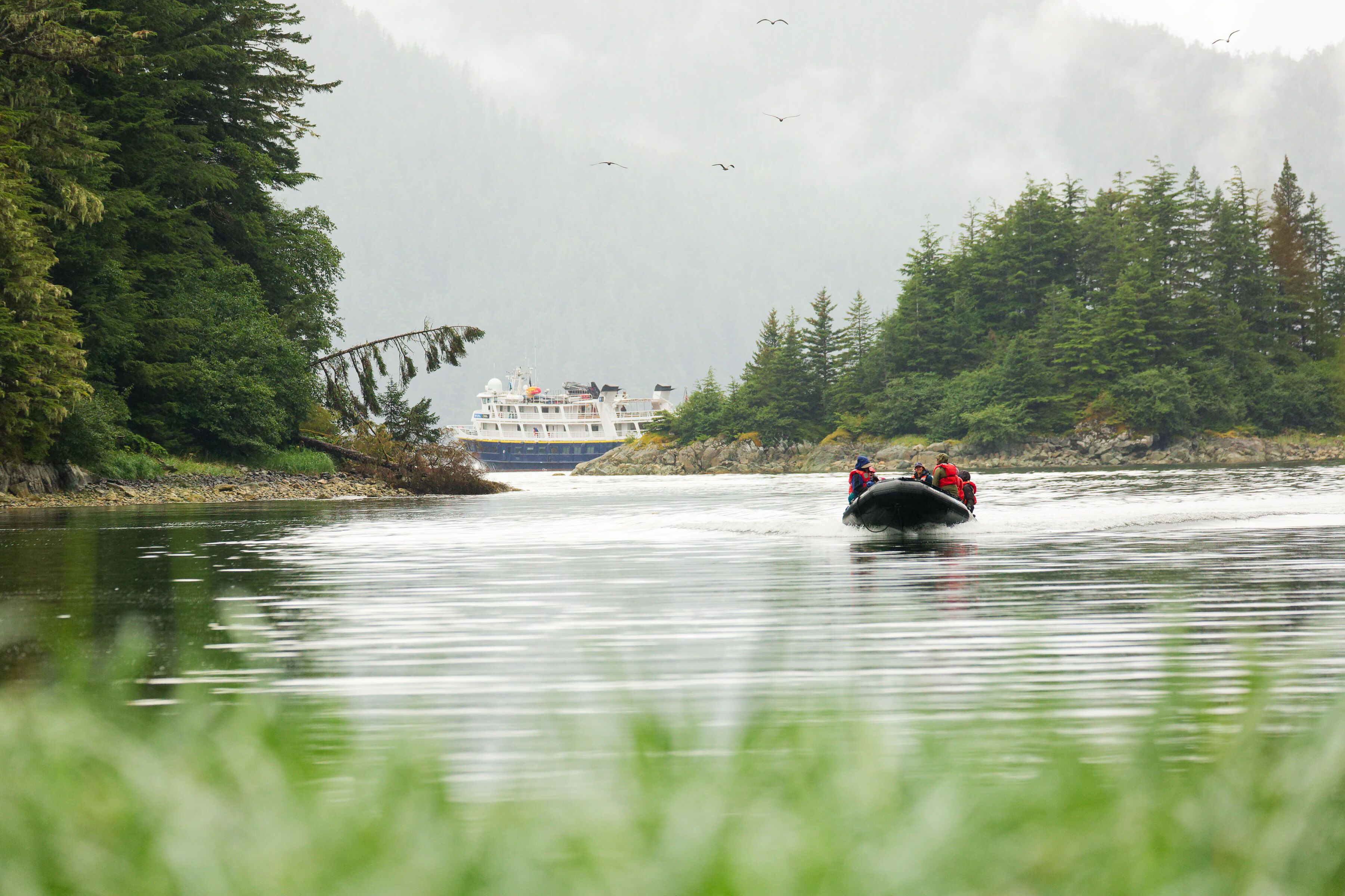 National Geographic Sea Lion made her way through Icy Strait to the confluence of the Inside Passage and the Pacific Ocean this morning. Here lies one of the most special places in Alaska: the Inian Islands. From our Zodiacs, we had a truly expeditionary morning exploring the waterways between the islands. The extreme tides here bring a buffet of food for local wildlife, such as the sea otters, Steller sea lions, harbor seals, and bald eagles we saw this morning. We then made a short trip to Port Althorp, just south of the Inian Islands, and spent the afternoon hiking. The sun was out as we explored the coastline and then headed inland to the magical forest of tall trees, mosses, and ferns. After a crab feast dinner, the bow was the place to be as pods of Dall’s porpoises visited to bow ride the ship. It was a perfect day, encompassing everything it means to travel on an expedition.