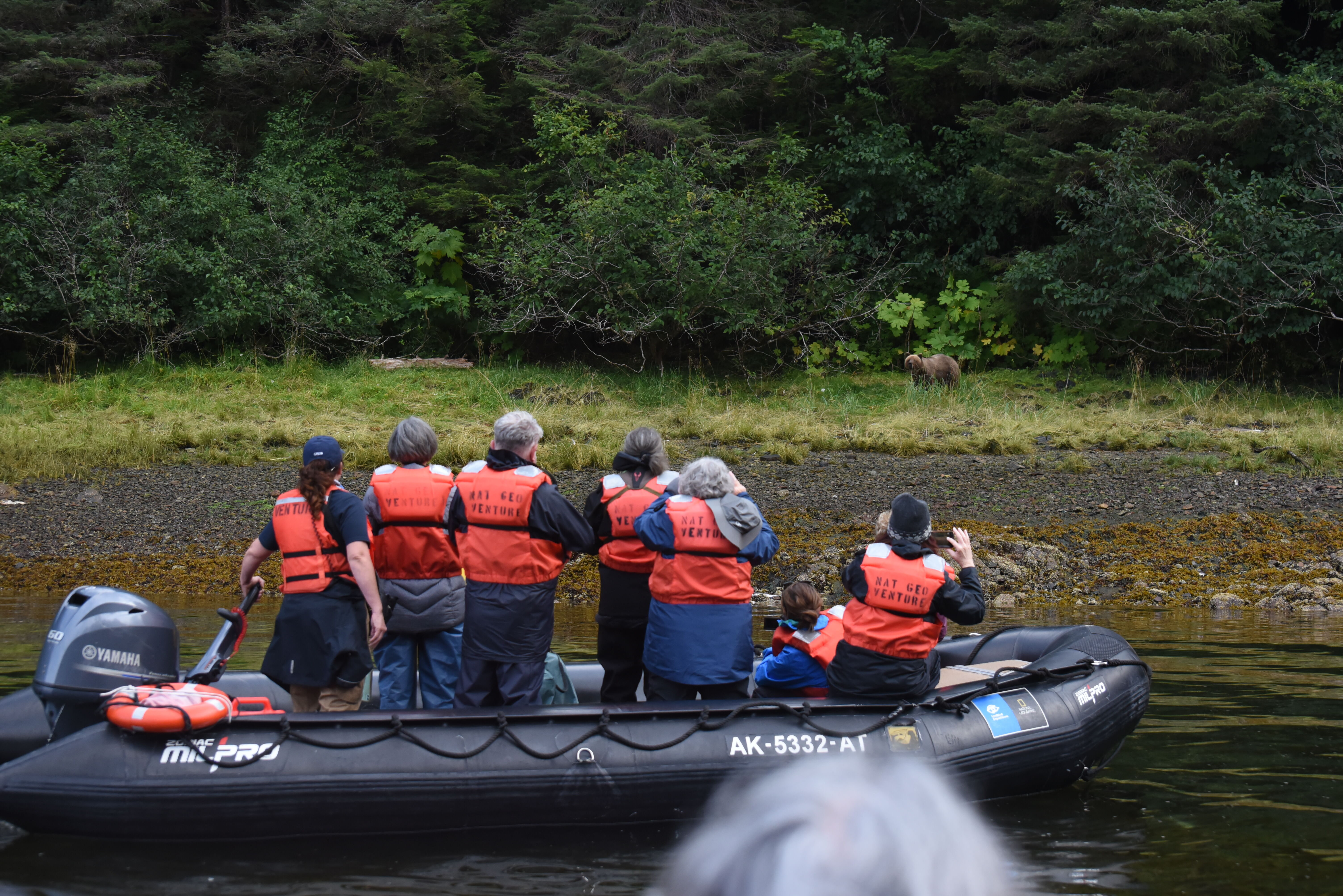 Haines Day. Always a day of multiple adventures. Some guests went on a long hike to the top of Mt. Riley for the exercise and view. A shorter but just as interesting hike led hikers to Battery Point through a beautiful forest. Others went on a fly-fishing trip to Chilkat River and caught (and then released) several pink salmon. Another opportunity was a visit to the Klukwan Village Interpretive Center and a subsequent Chilkat River float. A glacial fjord cycle trip was also enjoyed by some guests, all of whom saw a mother brown bear with two frisky cubs. And finally, all guests had the opportunity to wander through Haines and visit shops, the distillery, and the Sheldon Museum. Unfortunately, the world-famous Hammer Museum with hundreds of hammers of all sizes, shapes, and functions collected from all over the world was closed.