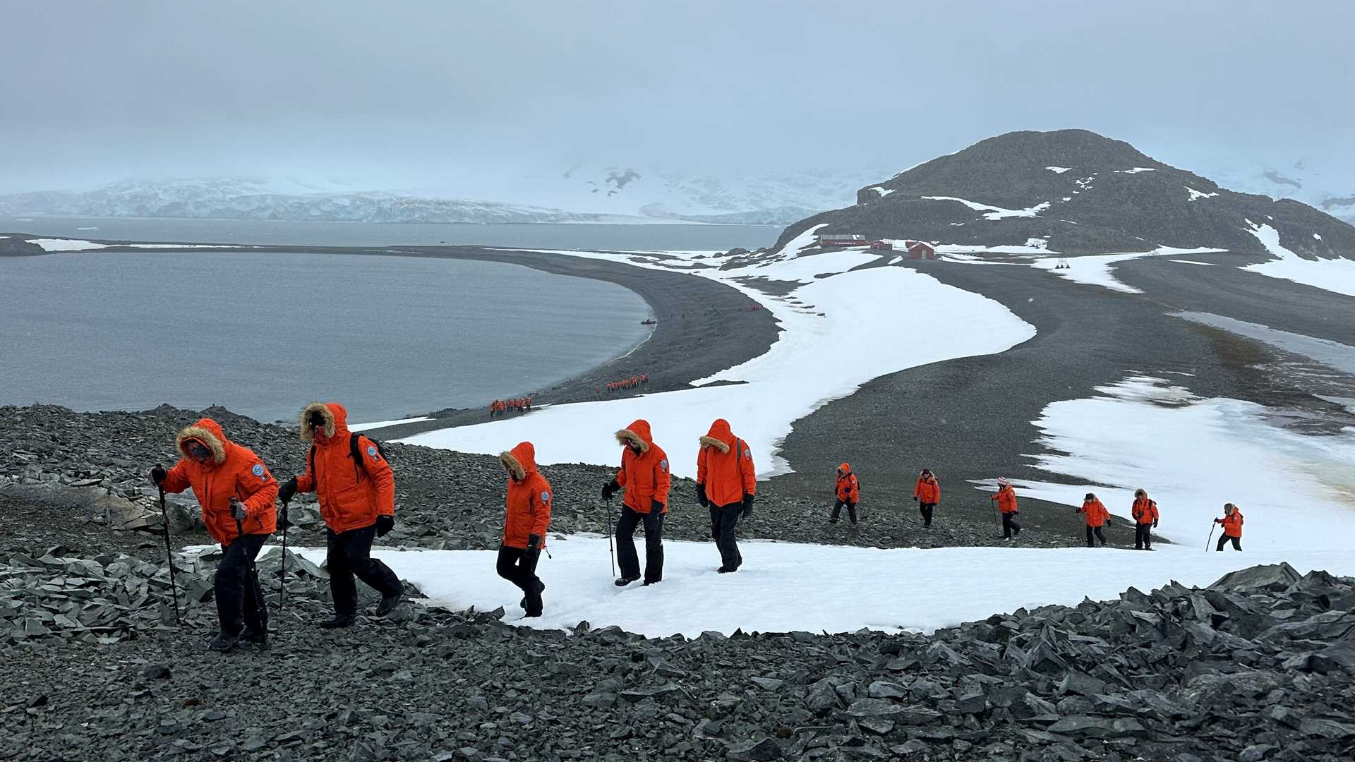 As we were taking full advantage of a “better than forecasted” crossing of the Drake, National Geographic Resolution arrived at Antarctica earlier than expected. We landed at Halfmoon Island for our first excursion of the voyage. After a fantastic hike, we were awarded amazing views of Livingston Island as the sun tried to peek out of the clouds between squalls of snow. Upon returning to the beach, we visited the penguin colony and were welcomed by all three brush-tailed penguins: chinstrap, gentoo, and even a visiting Adelie!